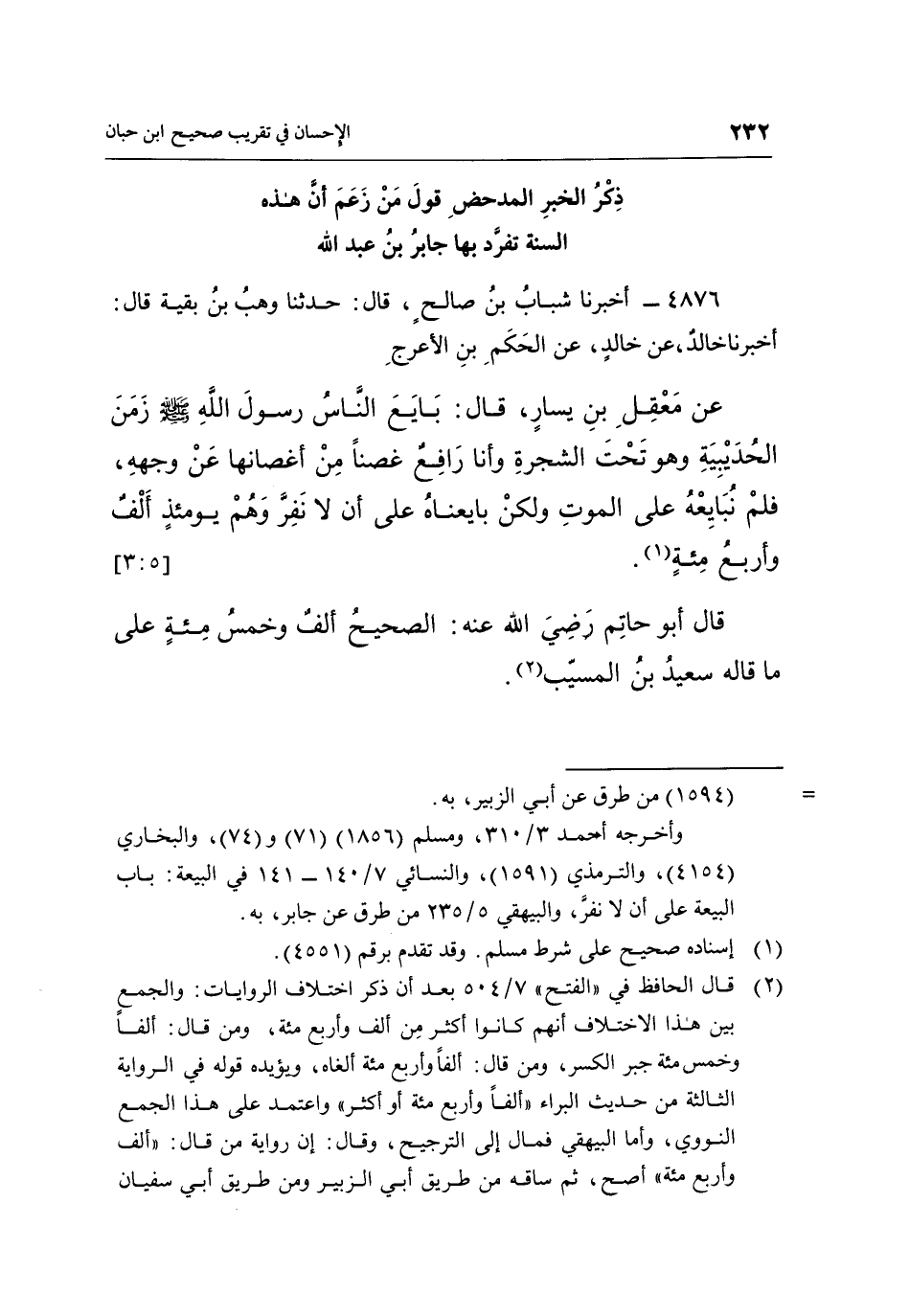 4876 - أَخْبَرَنَا شَبَابُ بْنُ صَالِحٍ، قَالَ: حَدَّثَنَا وَهْبُ بْنُ بَقِيَّةَ، قَالَ أَخْبَرَنَا خَالِدٌ، عَنْ خَالِدٍ، عَنِ الْحَكَمِ بْنِ الْأَعْرَجِ، عَنْ مَعْقِلِ بْنِ يَسَارٍ، قَالَ: «ثُمَّ بَايَعَ النَّاسُ رَسُولَ اللَّهِ صَلَّى اللَّهُ عَلَيْهِ وَسَلَّمَ زَمَنَ الْحُدَيْبِيَةِ وَهُوَ تَحْتَ الشَّجَرَةِ وَأَنَا رَافِعٌ غُصْنًا مِنْ أَغْصَانِهَا عَنْ وَجْهِهِ، فَلَمْ نُبَايِعْهُ عَلَى الْمَوْتِ وَلَكِنْ بَايَعْنَاهُ عَلَى أَنْ لَا نَفِرَّ وَهُمْ يَوْمَئِذٍ أَلْفٌ وَأَرْبَعُ مِائَةٍ (¬1) . [5: 3]