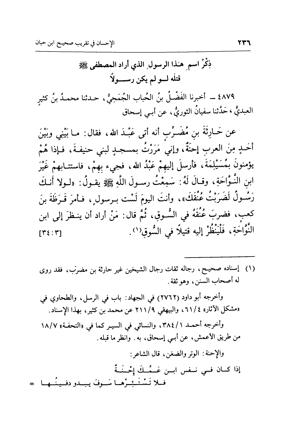 4879 - أَخْبَرَنَا الْفَضْلُ بْنُ الْحُبَابِ الْجُمَحِيُّ، حَدَّثَنَا مُحَمَّدُ بْنُ كَثِيرٍ الْعَبْدِيُّ، حَدَّثَنَا سُفْيَانُ الثَّوْرِيُّ، عَنْ أَبِي إِسْحَاقَ، عَنْ حَارِثَةَ بْنِ مُضَرِّبٍ، ثُمَّ إِنَّهُ أَتَى عَبْدَ اللَّهِ، فَقَالَ: مَا بَيْنِي وَبَيْنَ أَحَدٍ مِنَ الْعَرَبِ إِحْنَةٌ، وَإِنِّي مَرَرْتُ بِمَسْجِدٍ لِبَنِي حَنِيفَةَ، فَإِذَا هُمْ يُؤْمِنُونَ بِمُسَيْلِمَةَ، فَأَرْسَلَ إِلَيْهِمْ عَبْدَ اللَّهِ، فَجِيءَ بِهِمْ فَاسْتَتَابَهُمْ غَيْرَ ابْنِ النَّوَّاحَةِ، وَقَالَ: لَهُ سَمِعْتُ رَسُولَ اللَّهِ صَلَّى اللَّهُ عَلَيْهِ وَسَلَّمَ، يَقُولُ: «لَوْلَا أَنَّكَ رَسُولٌ لَضَرَبْتُ عُنُقَكَ وَأَنْتَ الْيَوْمَ لَسْتَ بِرَسُولٍ» ، فَأَمَرَ قَرَظَةَ بْنَ كَعْبٍ، فَضَرَبَ عُنُقَهُ فِي السُّوقِ، ثُمَّ قَالَ: «مَنْ أَرَادَ أَنْ يَنْظُرَ إِلَى ابْنِ النَّوَّاحَةِ، فَلْيَنْظُرْ إِلَيْهِ قَتِيلًا، فِي السُّوقِ» (¬1) . [3: 34]