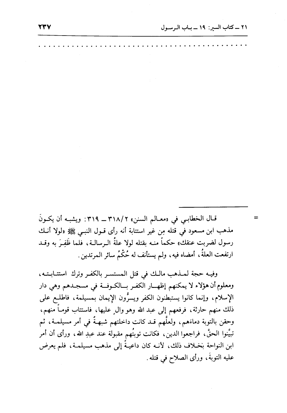 = قال الخطابي في " معالم السنن " 2/318-319: ويشبه أن يكونَ مذهب ابن مسعود في قتله من غير استتابة أنه رأى قول النبى صَلَّى اللَّهُ عَلَيْهِ وَسَلَّمَ " لولا أنك رسول لضربت عنقك " حكماً منه بقتله لولا علةُ الرسالة، فلما ظَفِرَ به وقد ارتفعت العلةُ، أمضاه فيه، ولم يستأنف له حُكْمُ سائر المرتدين.