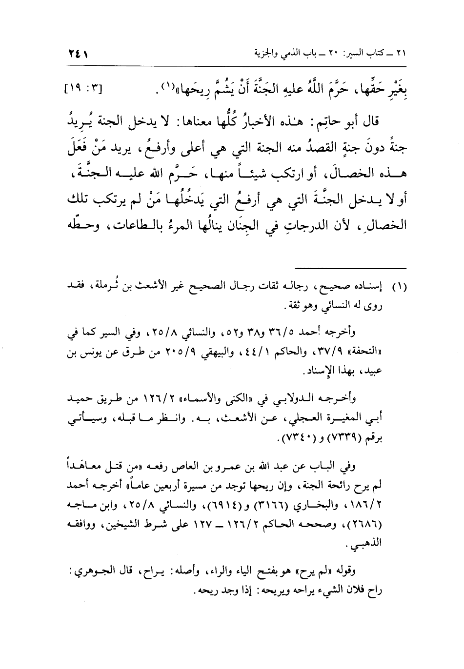 قَالَ أَبُو حَاتِمٍ: «هَذِهِ الْأَخْبَارُ كُلُّهَا مَعْنَاهَا لَا يَدْخُلُ الْجَنَّةَ يُرِيدُ جَنَّةً دُونَ جَنَّةِ الْقَصْدِ مِنْهُ، الْجَنَّةُ الَّتِي هِيَ أَعْلَى وَأَرْفَعُ يُرِيدُ مَنْ فَعَلَ هَذِهِ الْخِصَالَ، أَوِ ارْتَكَبَ شَيْئًا مِنْهَا حَرَّمَ اللَّهُ عَلَيْهِ الْجَنَّةَ، أَوْ لَا يَدْخُلُ الْجَنَّةَ الَّتِي هِيَ أَرْفَعُ الَّتِي يَدْخُلُهَا مَنْ لَمْ يَرْتَكِبْ تِلْكَ الْخِصَالَ، لِأَنَّ الدَّرَجَاتِ فِي الْجِنَانِ يَنَالُهَا الْمَرْءُ بِالطَّاعَاتِ، وَحَطُّهُ