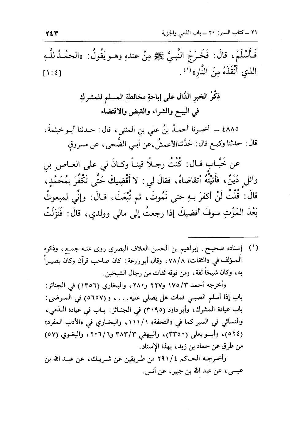 4885 - أَخْبَرَنَا أَحْمَدُ بْنُ عَلِيِّ بْنِ الْمُثَنَّى، قَالَ: حَدَّثَنَا أَبُو خَيْثَمَةَ، قَالَ: حَدَّثَنَا وَكِيعٌ، قَالَ: حَدَّثَنَا الْأَعْمَشُ، عَنْ أَبِي الضُّحَى، عَنْ مَسْرُوقٍ، عَنْ خَبَّابٍ، قَالَ: كُنْتُ رَجُلًا قَيْنًا وَكَانَ لِي عَلَى الْعَاصِ بْنِ وَائِلٍ دَيْنٌ فَأَتَيْتُهُ أَتَقَاضَاهُ، فَقَالَ لِي: «لَا أَقْضِيكَ حَتَّى تَكْفُرَ بِمُحَمَّدٍ» ، قَالَ: قُلْتُ: «لَنْ أَكْفُرَ بِهِ حَتَّى تَمُوتَ، ثُمَّ تُبْعَثَ» ، قَالَ: «وَإِنِّي لَمَبْعُوثٌ بَعْدَ الْمَوْتِ سَوْفَ أَقْضِيكَ، إِذَا رَجَعْتَ إِلَيَّ مَالِي، وَوَلَدِي» ، قَالَ: «فَنَزَلَتْ،