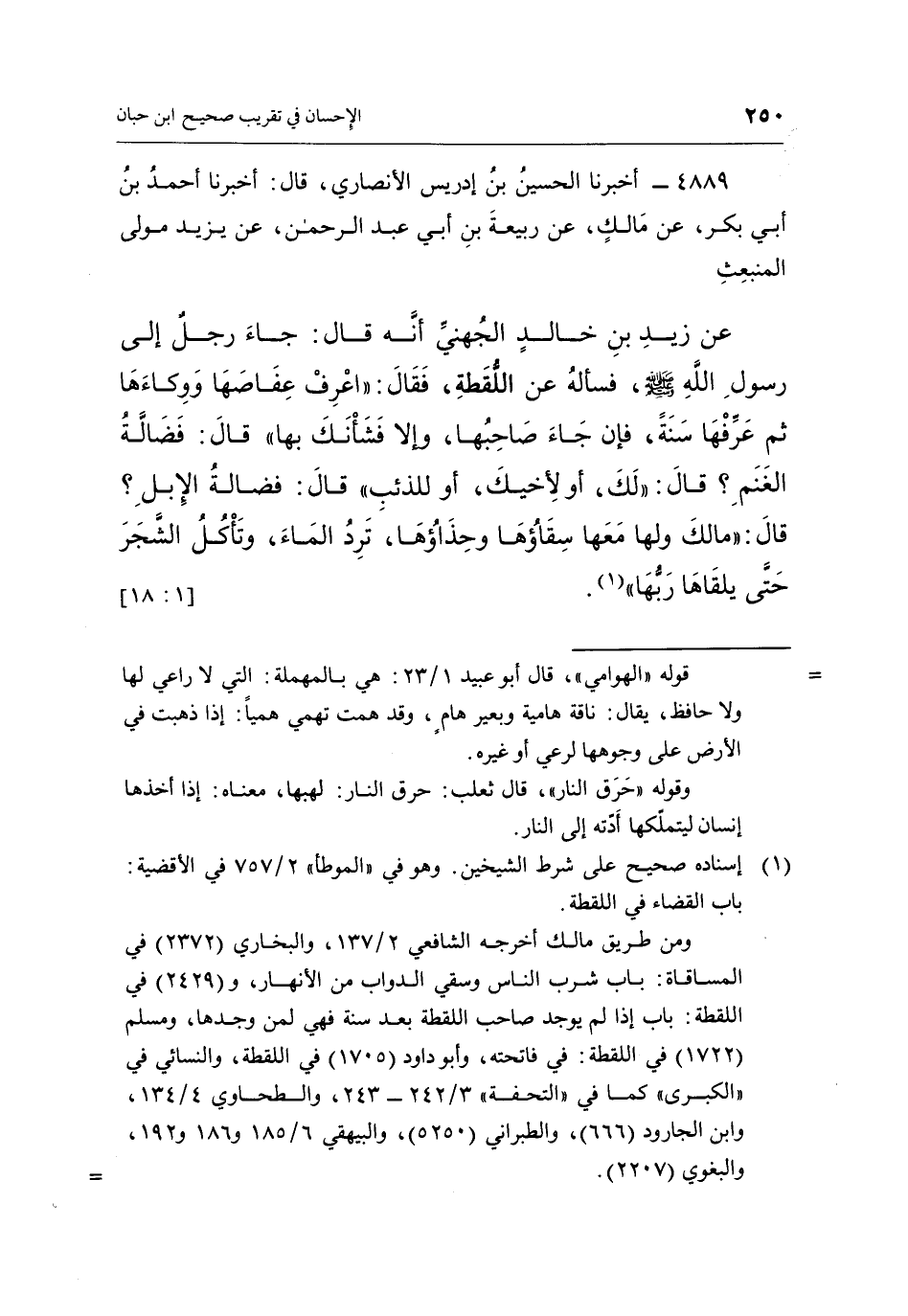 4889 - أَخْبَرَنَا الْحُسَيْنُ بْنُ إِدْرِيسَ الْأَنْصَارِيُّ، قَالَ: أَخْبَرَنَا أَحْمَدُ بْنُ أَبِي بَكْرٍ، عَنْ مَالِكٍ، عَنْ رَبِيعَةَ بْنِ أَبِي عَبْدِ الرَّحْمَنِ، عَنْ يَزِيدَ مَوْلَى الْمُنْبَعِثِ عَنْ زَيْدِ بْنِ خَالِدٍ الْجُهَنِيِّ أَنَّهُ قَالَ: جَاءَ رَجُلٌ إِلَى رَسُولِ اللَّهِ صَلَّى اللَّهُ عَلَيْهِ وَسَلَّمَ فَسَأَلَهُ، عَنِ اللُّقَطَةِ، فَقَالَ: "اعْرِفْ عِفَاصَهَا وَوِكَاءَهَا ثُمَّ عَرِّفْهَا سَنَةً، فَإِنْ جَاءَ صَاحِبُهَا، وَإِلَّا فَشَأْنَكَ بِهَا" قَالَ: فَضَالَّةُ الْغَنَمِ؟ قَالَ: "لَكَ، أَوْ لِأَخِيكَ، أَوْ لِلذِّئْبِ" قَالَ: فَضَالَّةُ الْإِبِلِ؟ قَالَ: "مَا لَكَ وَلَهَا مَعَهَا سِقَاؤُهَا وَحِذَاؤُهَا، تَرِدُ الْمَاءَ، وَتَأْكُلُ الشجر حتى يلقاها ربها"1. [1: 18]