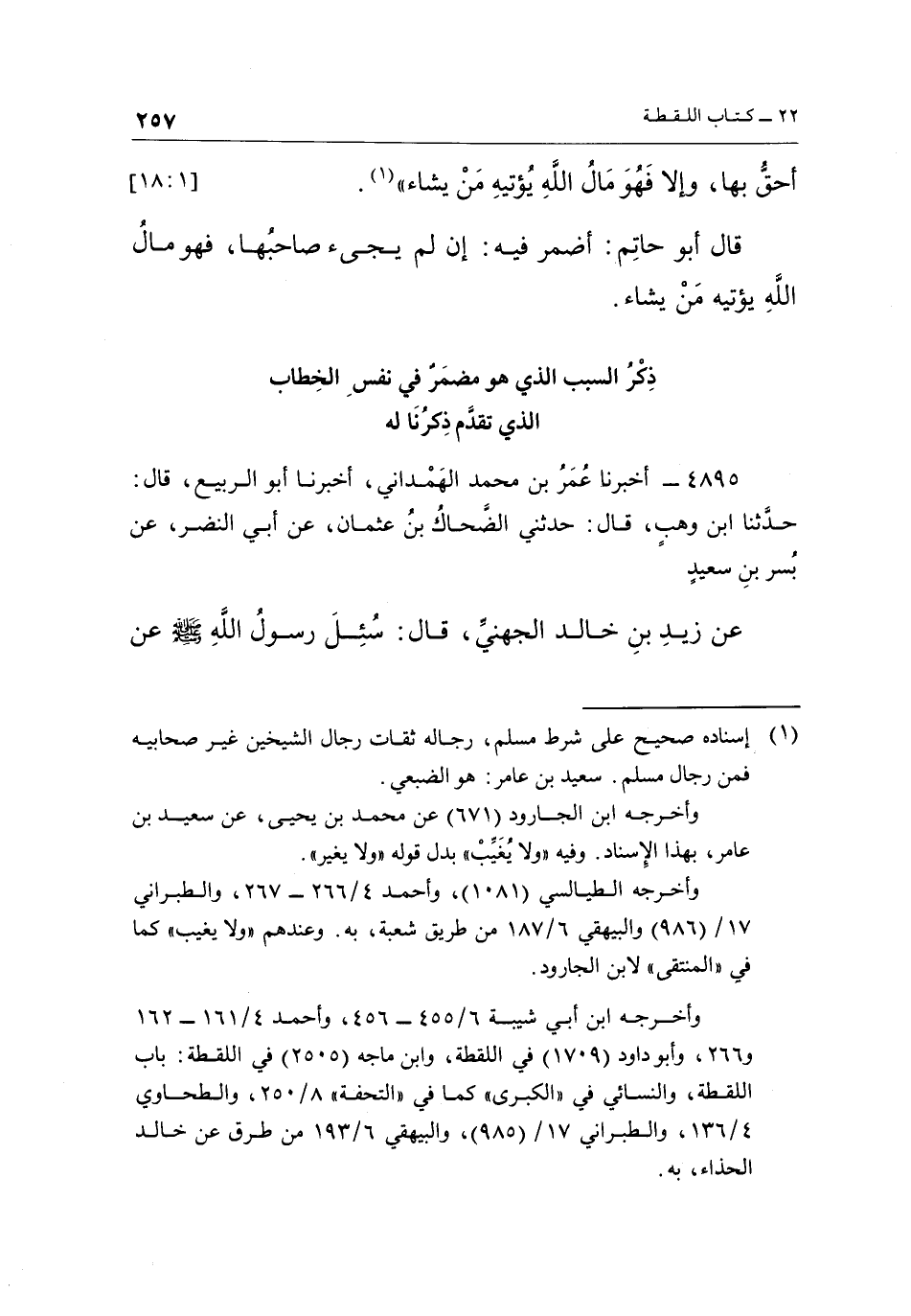وأخرجه ابن أبي شيبة 6/455 - 456، وأحمد 4/161 - 162 و266، وأبو داود "1709" في للقطة، ابن ماجه "2505"في اللقطة: باب اللقطة، والنسائي في "الكبرى" كما في "التحفة "8/250، والحطاوي 4/136، الطبراني 17/985، البيهقي 6/193/ من طرق عن خالد الحذاء، به.