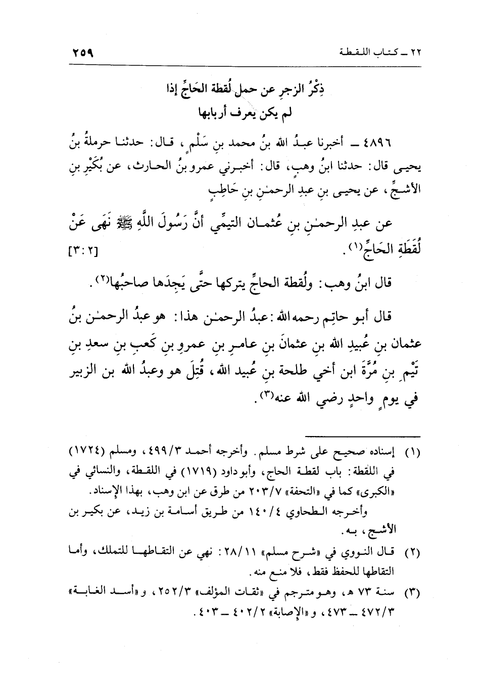قَالَ بن وهب: ولقطة الحج يَتْرُكُهَا حَتَّى يَجِدَهَا صَاحِبُهَا2. قَالَ أَبُو حَاتِمٍ رَحِمَهُ اللَّهُ: عَبْدُ الرَّحْمَنِ هَذَا: هُوَ عَبْدُ الرَّحْمَنِ بْنُ عُثْمَانَ بْنِ عُبَيْدِ اللَّهِ بْنِ عُثْمَانَ بْنِ عَامِرِ بْنِ عَمْرِو بْنِ كَعْبِ بن سعد بن تيم بن مرة بن أَخِي طَلْحَةَ بْنِ عُبَيْدِ اللَّهِ، قُتِلَ هُوَ وعبد الله بن الزبير ي يوم واحد رضي الله عنه3.