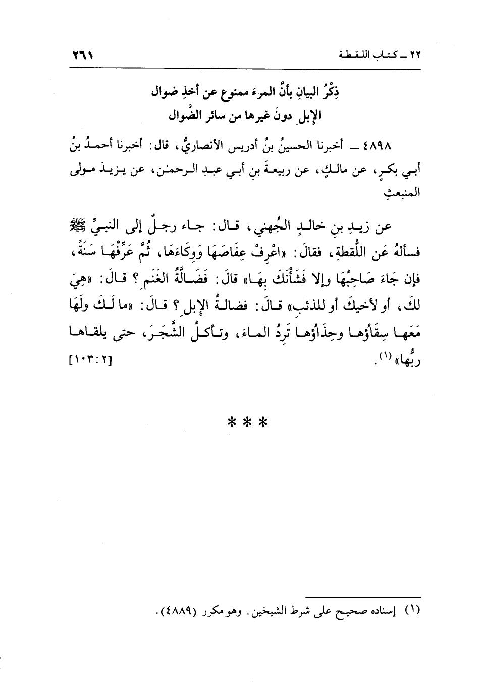 4898 - أَخْبَرَنَا الْحُسَيْنُ بْنُ إِدْرِيسَ الْأَنْصَارِيُّ، قَالَ: أَخْبَرَنَا أَحْمَدُ بْنُ أَبِي بَكْرٍ، عَنْ مَالِكٍ، عَنْ رَبِيعَةَ بْنِ أَبِي عَبْدِ الرَّحْمَنِ، عَنْ يَزِيدَ مَوْلَى الْمُنْبَعِثِ عَنْ زَيْدِ بْنِ خَالِدٍ الْجُهَنِيَّ، قَالَ: جَاءَ رَجُلٌ إِلَى النَّبِيِّ صَلَّى اللَّهُ عَلَيْهِ وَسَلَّمَ فَسَأَلَهُ عَنِ اللُّقَطَةِ، فَقَالَ: "اعْرِفْ عِفَاصَهَا وَوِكَاءَهَا، ثُمَّ عَرِّفْهَا سَنَةً، فَإِنْ جَاءَ صَاحِبُهَا وَإِلَّا فَشَأْنَكَ بِهَا" قَالَ: فَضَالَّةُ الْغَنَمِ؟ قَالَ: "هِيَ لَكَ، أَوْ لِأَخِيكَ أَوْ لِلذِّئْبِ" قَالَ: فَضَالَّةُ الْإِبِلِ؟ قَالَ: "مَا لَكَ وَلَهَا مَعَهَا سِقَاؤُهَا وَحِذَاؤُهَا تَرِدُ الْمَاءَ، وَتَأْكُلُ الشَّجَرَ، حتى يلقاها ربها"1. [2: 103]