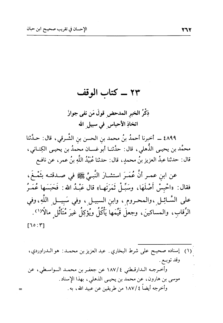 4899 - أَخْبَرَنَا أَحْمَدُ بْنُ مُحَمَّدِ بْنِ الْحَسَنِ بْنِ الشَّرْقِيِّ، قَالَ: حَدَّثَنَا مُحَمَّدُ بْنُ يَحْيَى الذُّهْلِيُّ، قَالَ: حَدَّثَنَا أَبُو غَسَّانَ مُحَمَّدُ بْنُ يَحْيَى الْكِنَانِيُّ، قَالَ حَدَّثَنَا عَبْدُ الْعَزِيزِ بْنُ مُحَمَّدٍ، قَالَ: حَدَّثَنَا عُبَيْدُ اللَّهِ بْنُ عُمَرَ، عَنْ نَافِعٍ عَنِ بن عُمَرَ أَنَّ عُمَرَ اسْتَشَارَ النَّبِيَّ صَلَّى اللَّهُ عَلَيْهِ وَسَلَّمَ فِي صَدَقَتِهِ بِثَمْغٍ، فَقَالَ: "احْبِسْ أَصْلَهَا، وَسَبِّلْ ثَمَرَتَهَا" قَالَ عَبْدُ اللَّهِ: فَحَبَسَهَا عُمَرُ عَلَى السَّائِلِ، وَالْمَحْرُومِ، وَابْنِ السَّبِيلِ، وَفِي سَبِيلِ اللَّهِ، وَفِي الرِّقَابِ، وَالْمَسَاكِينِ، وَجَعَلَ قَيِّمَهَا يأكل ويؤكل غير متأثل مالا1. [3: 65]
