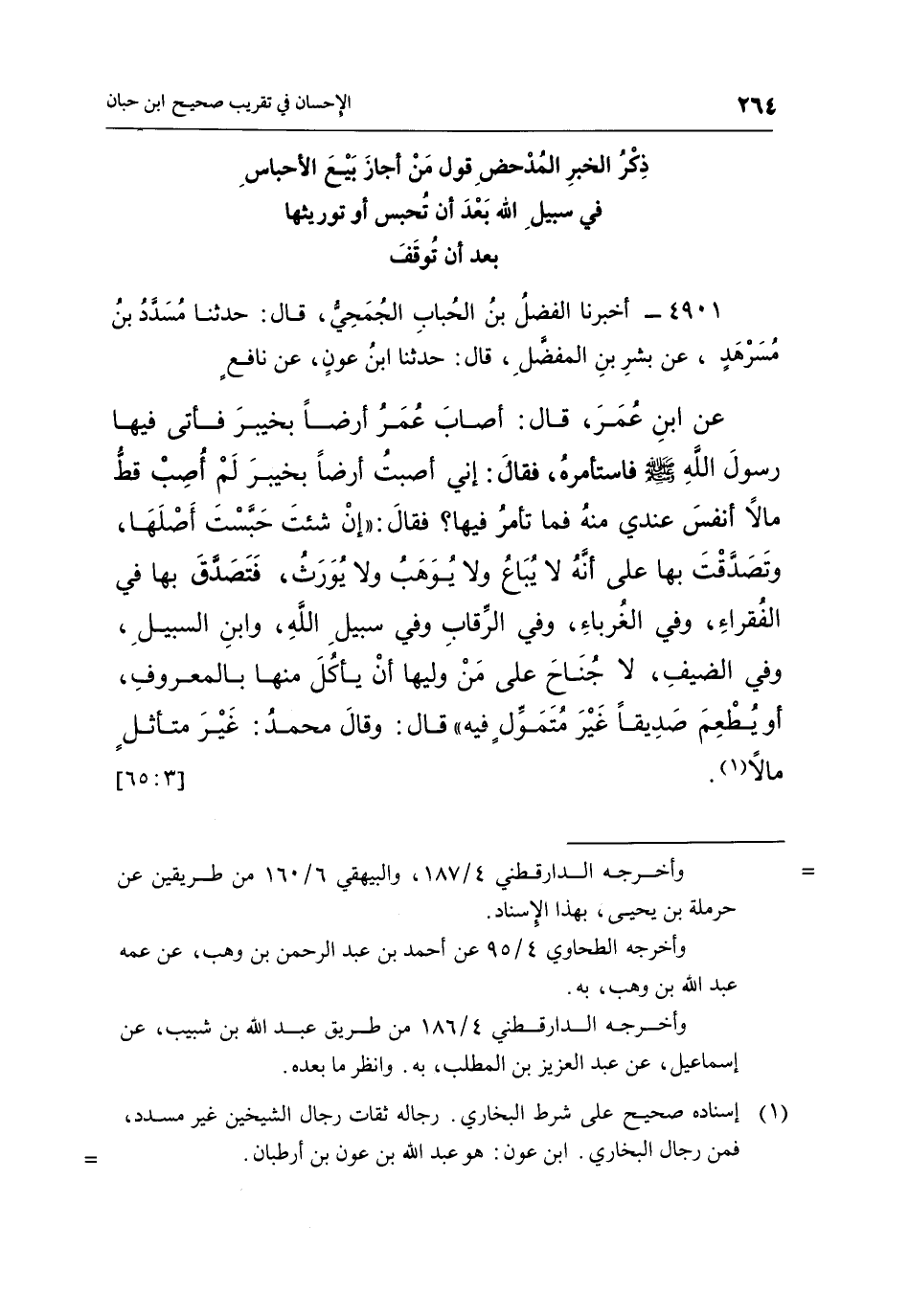 4901 - أَخْبَرَنَا الْفَضْلُ بْنُ الْحُبَابِ الْجُمَحِيُّ، قَالَ: حَدَّثَنَا مُسَدَّدُ بْنُ مُسَرْهَدٍ، عَنْ بِشْرِ بْنِ الْمُفَضَّلِ، قَالَ: حَدَّثَنَا بن عون، عن نافع عن بن عُمَرَ، قَالَ: أَصَابَ عُمَرُ أَرْضًا بِخَيْبَرَ فَأَتَى فِيهَا رَسُولُ اللَّهِ صَلَّى اللَّهُ عَلَيْهِ وَسَلَّمَ فَاسْتَأْمَرَهُ، فَقَالَ: إِنِّي أَصَبْتُ أَرْضًا بِخَيْبَرَ لَمْ أُصِبْ قَطُّ مَالًا أَنْفَسَ عِنْدِي مِنْهُ فَمَا تَأْمُرُ فِيهَا؟ فَقَالَ: "إِنْ شِئْتَ حَبَسْتَ أَصْلَهَا، وَتَصَدَّقْتَ بِهَا عَلَى أَنَّهُ لَا يُبَاعُ وَلَا يُوهَبُ وَلَا يُورَثُ، فَتَصَدَّقْ بِهَا فِي الْفُقَرَاءِ، وَفِي الْغُرَبَاءِ، وَفِي الرِّقَابِ وَفِي سَبِيلِ اللَّهِ، وَابْنِ السَّبِيلِ، وَفِي الضَّيْفِ، لَا جُنَاحَ عَلَى مَنْ وَلِيَهَا أَنْ يَأْكُلَ مِنْهَا بِالْمَعْرُوفِ، أَوْ يُطْعِمَ صَدِيقًا غَيْرَ مُتَمَوِّلٍ فِيهِ" قَالَ: وَقَالَ محمد: غير متأثل مالا". [3: 65]
