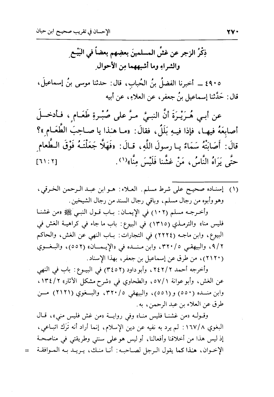 4905 - أَخْبَرَنَا الْفَضْلُ بْنُ الْحُبَابِ، قَالَ: حَدَّثَنَا مُوسَى بْنُ إِسْمَاعِيلَ، قَالَ: حَدَّثَنَا إِسْمَاعِيلَ بْنِ جَعْفَرٍ، عَنِ الْعَلَاءِ، عَنْ أَبِيهِ عَنْ أَبِي هُرَيْرَةَ أَنَّ النَّبِيَّ مَرَّ عَلَى صُبْرَةِ طَعَامٍ، فَأَدْخَلَ أَصَابِعَهُ فِيهَا، فَإِذَا فِيهِ بَلَلٌ، فَقَالَ: "مَا هَذَا يَا صَاحِبَ الطَّعَامِ"؟ قَالَ: أَصَابَتْهُ سَمَاءٌ يَا رَسُولَ اللَّهِ، قَالَ: "فَهَلَّا جَعَلْتَهُ فَوْقَ الطَّعَامِ حَتَّى يَرَاهُ النَّاسُ، مَنْ غَشَّنَا فَلَيْسَ منا"1. [2: 61]
