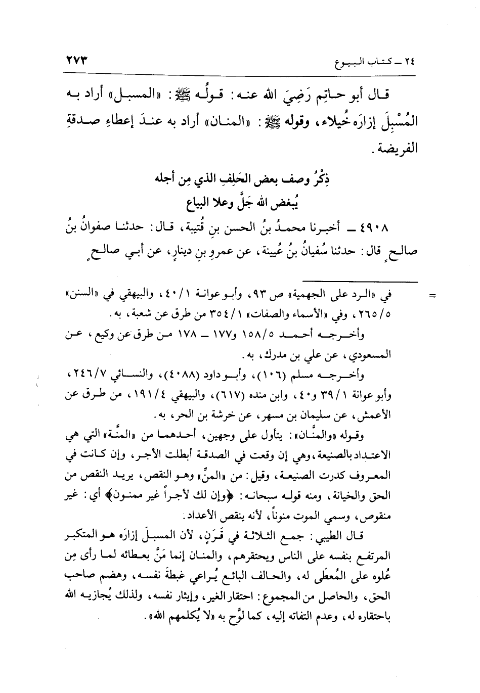 قال أبو حاتم رضى الله تعالى عَنْهُ: قَوْلُهُ صَلَّى اللَّهُ عَلَيْهِ وَسَلَّمَ: "الْمُسْبِلُ" أَرَادَ بِهِ الْمُسْبِلَ إِزَارَهُ خُيَلَاءَ، وَقَوْلُهُ صَلَّى اللَّهُ عَلَيْهِ وَسَلَّمَ: "الْمَنَّانُ" أَرَادَ بِهِ عِنْدَ إعطاء صدقه الفريضه".