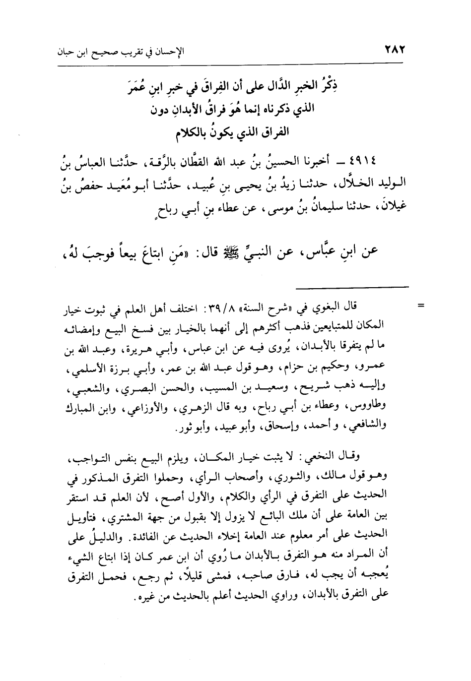 4914 - أَخْبَرَنَا الْحُسَيْنُ بْنُ عَبْدِ اللَّهِ الْقَطَّانُ بِالرَّقَّةِ، حَدَّثَنَا الْعَبَّاسُ بْنُ الْوَلِيدِ الْخَلَّالُ، حَدَّثَنَا زَيْدُ بْنُ يَحْيَى بْنِ عُبَيْدٍ، حَدَّثَنَا أَبُو مُعَيْدٍ حَفْصُ بْنُ غَيْلَانَ، حَدَّثَنَا سُلَيْمَانُ بْنُ مُوسَى، عَنْ عَطَاءِ بن أبي رباح عن بن عَبَّاسٍ عَنِ النَّبِيِّ صَلَّى اللَّهُ عَلَيْهِ وَسَلَّمَ: قَالَ: "مَنِ ابْتَاعَ بَيْعًا فَوَجَبَ لَهُ،
