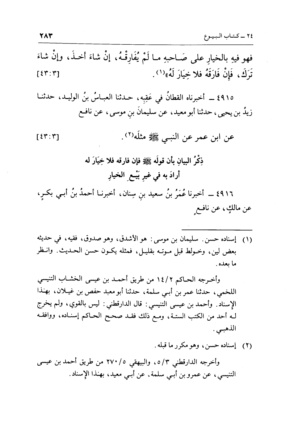 4915 - أَخْبَرَنَاهُ الْقَطَّانُ فِي عَقِبِهِ، حَدَّثَنَا الْعَبَّاسُ بْنُ الْوَلِيدِ، حَدَّثَنَا زَيْدُ بْنُ يَحْيَى، حَدَّثَنَا أَبُو مُعَيْدٍ، عَنْ سُلَيْمَانَ بْنِ مُوسَى، عَنْ نَافِعٍ عَنِ ابْنِ عُمَرَ عَنِ النَّبِيِّ صَلَّى اللَّهُ عَلَيْهِ وَسَلَّمَ مِثْلَهُ2. [3: 43]