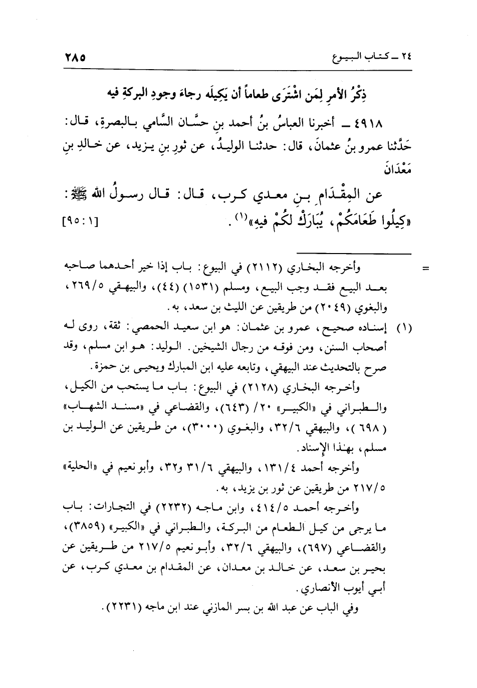 4918 - أَخْبَرَنَا الْعَبَّاسُ بْنُ أَحْمَدَ بْنِ حَسَّانَ السَّامِيُّ بِالْبَصْرَةِ، قَالَ: حَدَّثَنَا عَمْرُو بْنُ عُثْمَانَ، قَالَ: حَدَّثَنَا الْوَلِيدُ، عَنْ ثَوْرُ بْنُ يَزِيدَ، عَنْ خَالِدِ بْنِ مَعْدَانَ عَنِ الْمِقْدَامِ بْنِ مَعْدِي كَرِبَ، قَالَ: قَالَ رَسُولُ اللَّهِ صَلَّى اللَّهُ عَلَيْهِ وَسَلَّمَ: "كِيلُوا طعامكم يبارك لكم فيه"1. [1: 95]
