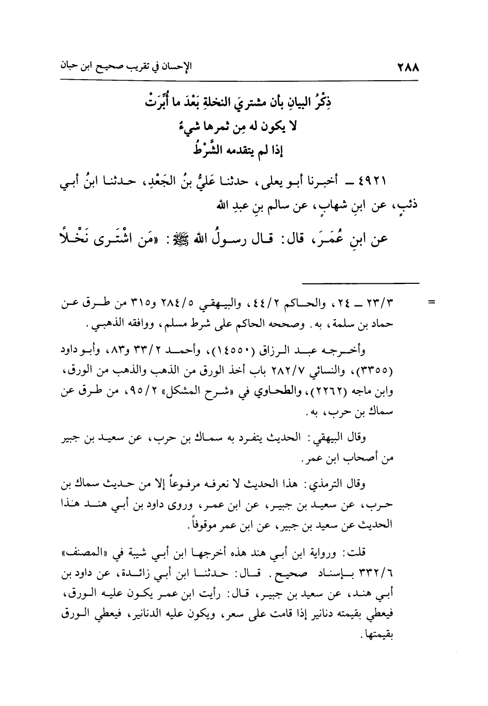 4921 - أَخْبَرَنَا أَبُو يَعْلَى، حَدَّثَنَا عَلِيُّ بْنُ الْجَعْدِ، حدثنا بن أبي ذئب، عن بن شِهَابٍ، عَنْ سَالِمِ بْنِ عَبْدِ اللَّهِ عَنْ بْنَ عُمَرَ قَالَ: قَالَ رَسُولُ اللَّهِ صَلَّى اللَّهُ عَلَيْهِ وَسَلَّمَ: "مَنِ اشْتَرَى نَخْلًا