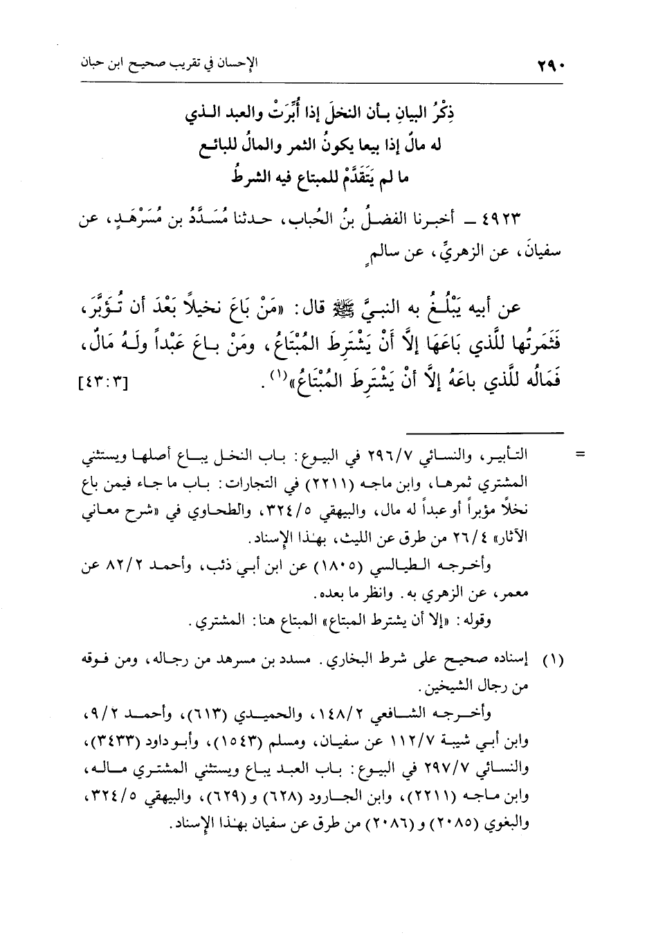 4923 - أَخْبَرَنَا الْفَضْلُ بْنُ الْحُبَابِ، حَدَّثَنَا مُسَدَّدُ بْنُ مُسَرْهَدٍ، عَنْ سُفْيَانُ، عَنِ الزُّهْرِيِّ، عَنْ سَالِمٍ عَنْ أَبِيهِ يَبْلُغُ بِهِ النَّبِيَّ صَلَّى اللَّهُ عَلَيْهِ وَسَلَّمَ قَالَ: "مَنْ بَاعَ نَخِيلًا بَعْدَ أَنْ تُؤَبَّرَ، فَثَمَرَتُهَا لِلَّذِي بَاعَهَا إِلَّا أَنْ يَشْتَرِطَ الْمُبْتَاعُ، وَمَنْ بَاعَ عَبْدًا وَلَهُ مَالٌ، فَمَالُهُ لِلَّذِي بَاعَهُ إِلَّا أَنْ يَشْتَرِطَ المبتاع"1. [3: 43]