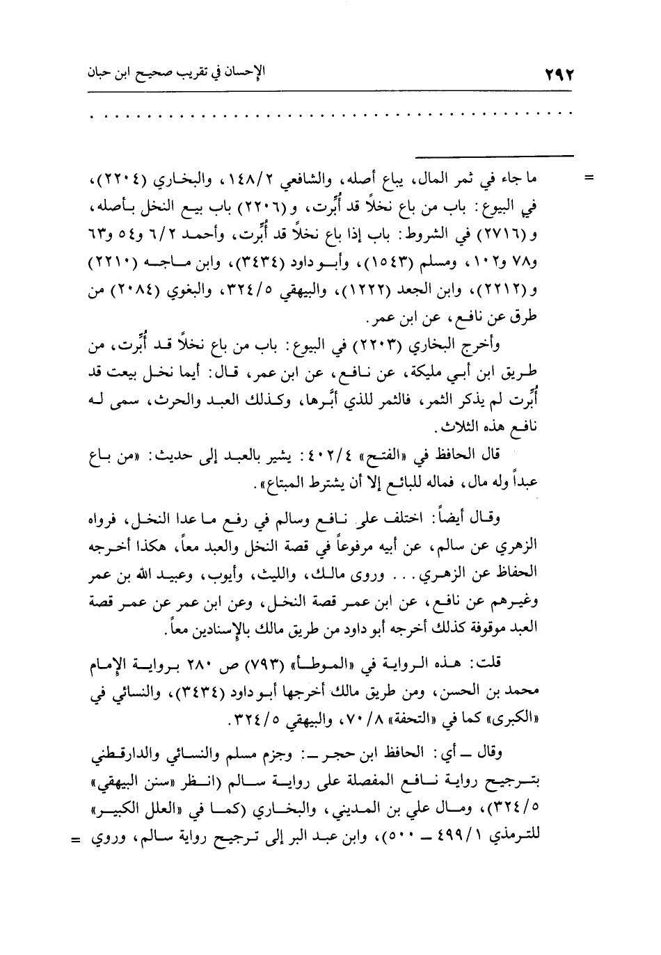 وقال –أي: الحافظ ابن حجر -: وجزم مسلم والنسائي والدارقطني بترجيح رواية نافع المفصلة على رواية سالم "وانظر "سنن البيهقي" 5/324"، ومال على بن المديني، والبخاري "كما في "العلل الكبير، للترمذي 1/499 - 500"، وابن عبد البر إلى ترجيح رواية سالم، وروي =
