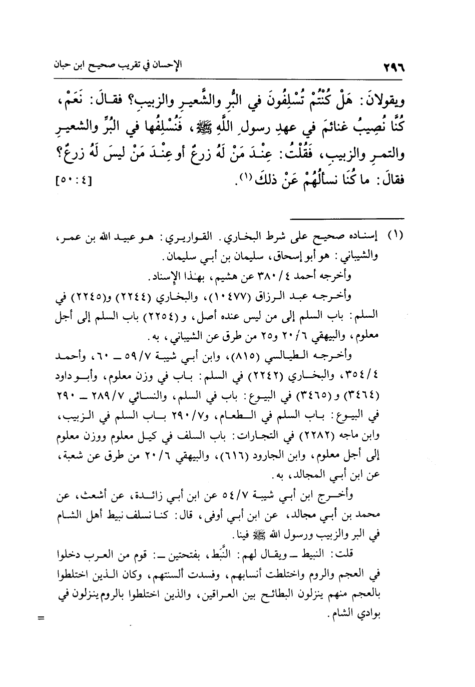 وَيَقُولَانِ: هَلْ كُنْتُمْ تُسْلِفُونَ فِي الْبُرِّ وَالشَّعِيرِ وَالزَّبِيبِ؟ فَقَالَ: نَعَمْ، كُنَّا نَصِيبُ غَنَائِمَ فِي عَهْدِ رَسُولِ اللَّهِ صَلَّى اللَّهُ عَلَيْهِ وَسَلَّمَ، فَنُسْلِفُهَا فِي الْبُرِّ وَالشَّعِيرِ وَالتَّمْرِ وَالزَّبِيبِ، فَقُلْتُ: عِنْدَ مَنْ لَهُ زَرْعٌ أَوْ عِنْدَ مَنْ لَيْسَ لَهُ زَرْعٌ؟ فَقَالَ: مَا كُنَّا نَسْأَلُهُمْ عن ذلك1. [4: 50]