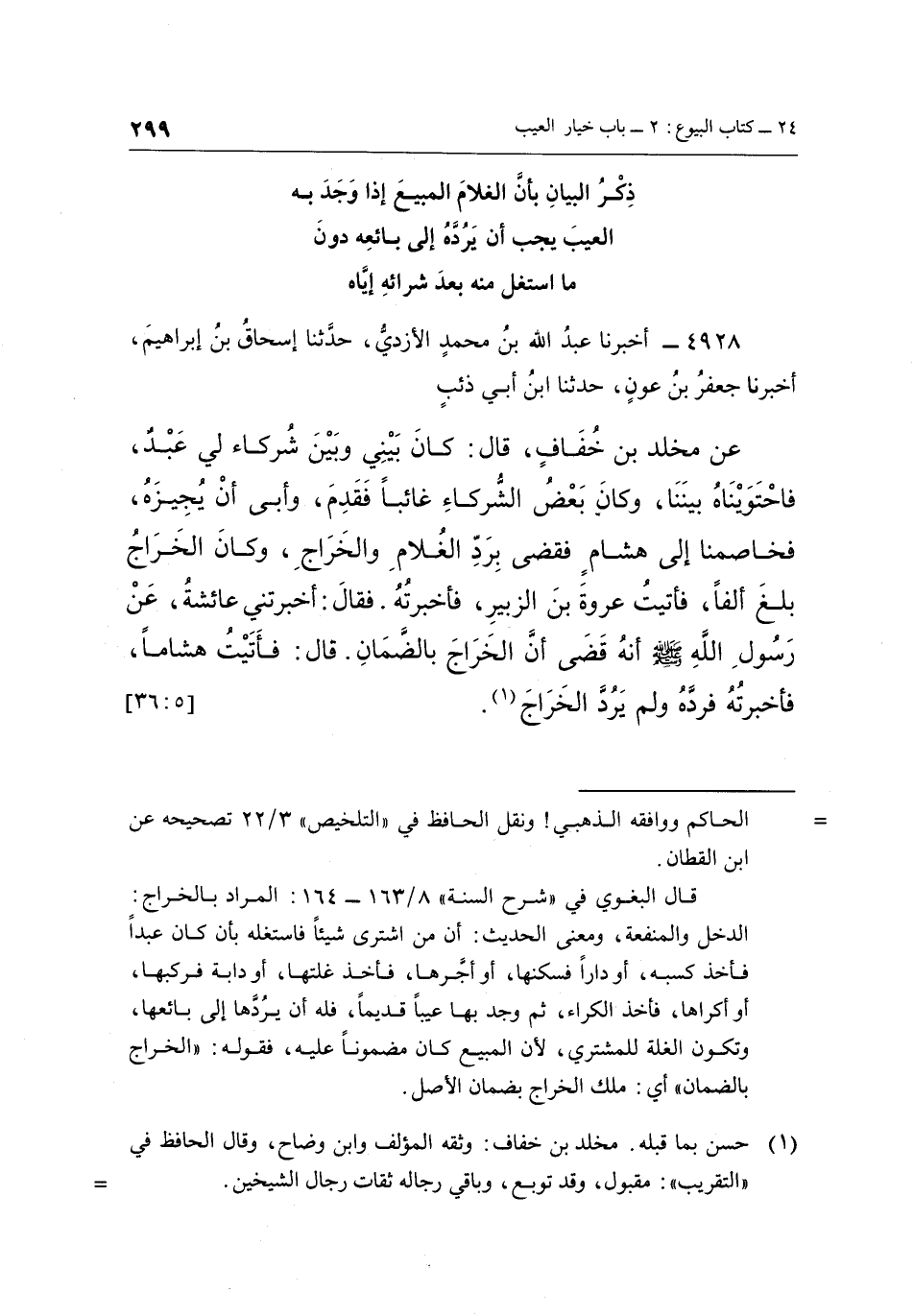 4928 - أَخْبَرَنَا عَبْدُ اللَّهِ بْنُ مُحَمَّدٍ الْأَزْدِيُّ، حَدَّثَنَا إِسْحَاقُ بْنُ إِبْرَاهِيمَ، أَخْبَرَنَا جَعْفَرُ بْنُ عَوْنٍ، حدثنا بن أَبِي ذِئْبٍ عَنْ مَخْلَدِ بْنِ خُفَافٍ، قَالَ: كَانَ بَيْنِي وَبَيْنَ شُرَكَاءَ لِي عَبْدٌ، فَاحْتَوَيْنَاهُ بَيْنَنَا، وَكَانَ بَعْضُ الشُّرَكَاءِ غَائِبًا فَقَدِمَ، وَأَبَى أَنْ يُجِيزَهُ، فَخَاصَمْنَا إِلَى هِشَامٍ فَقَضَى بِرَدِّ الْغُلَامِ وَالْخَرَاجِ، وَكَانَ الْخَرَاجُ بَلَغَ أَلْفًا، فَأَتَيْتُ عُرْوَةَ بْنَ الزُّبَيْرِ، فَأَخْبَرْتُهُ. فَقَالَ: أَخْبَرَتْنِي عَائِشَةَ، عَنْ رَسُولِ اللَّهِ صَلَّى اللَّهُ عَلَيْهِ وَسَلَّمَ: "أَنَّهُ قَضَى أَنَّ الْخَرَاجَ بِالضَّمَانِ". قَالَ: فَأَتَيْتُ هشاما، فأخبرته فرده ولم يرد الخراج1. [5: 36]