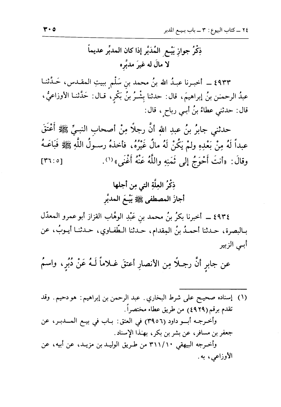 4933 - أَخْبَرَنَا عَبْدُ اللَّهِ بْنُ مُحَمَّدِ بْنِ سَلْمٍ بِبَيْتِ الْمَقْدِسِ، حَدَّثَنَا عَبْدُ الرَّحْمَنِ بْنُ إِبْرَاهِيمَ، قَالَ: حَدَّثَنَا بِشْرُ بْنُ بَكْرٍ، قَالَ: حَدَّثَنَا الْأَوْزَاعِيُّ، قَالَ: حَدَّثَنِي عَطَاءُ بْنُ أَبِي رَبَاحٍ، قَالَ: حَدَّثَنِي جَابِرُ بْنُ عَبْدِ اللَّهِ أَنَّ رَجُلًا مِنْ أَصْحَابِ النَّبِيِّ صَلَّى اللَّهُ عَلَيْهِ وَسَلَّمَ أَعْتَقَ عَبْدًا لَهُ مِنْ بَعْدَهُ وَلَمْ يَكُنْ لَهُ مَالٌ غَيْرُهُ، فَأَخَذَ رَسُولُ اللَّهِ صَلَّى اللَّهُ عَلَيْهِ وَسَلَّمَ فَبَاعَهُ وَقَالَ: "أَنْتَ أَحْوَجُ إِلَى ثَمَنِهِ وَاللَّهُ عنه أغنى"1. [5: 36]