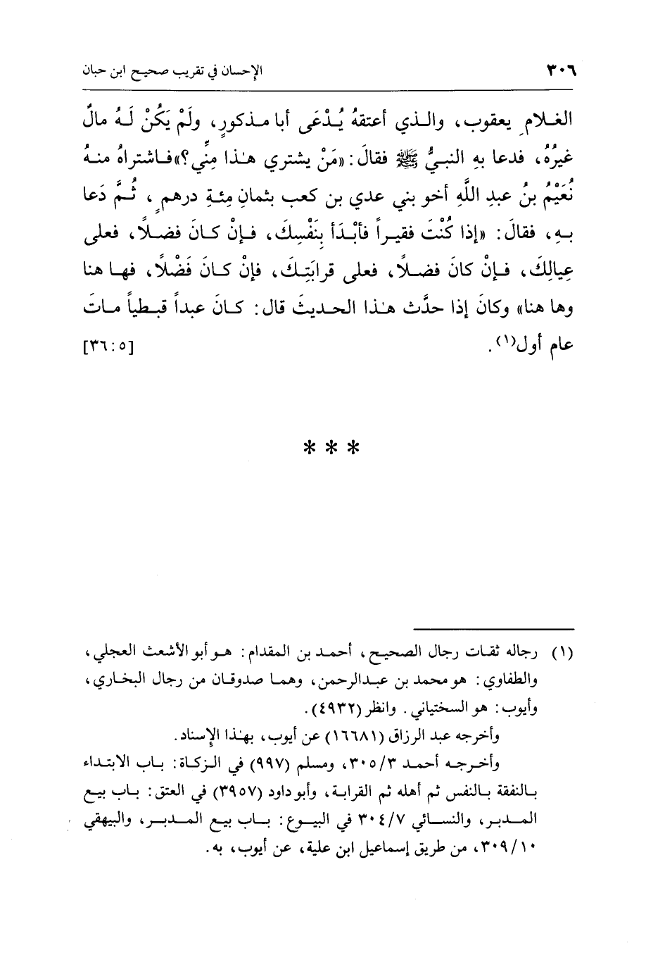 الْغُلَامِ يَعْقُوبُ، وَالَّذِي أَعْتَقَهُ يُدْعَى أَبَا مَذْكُورٍ، وَلَمْ يَكُنْ لَهُ مَالٌ غَيْرُهُ، فَدَعَا بِهِ النَّبِيِّ صَلَّى اللَّهُ عَلَيْهِ وَسَلَّمَ فَقَالَ: "مَنْ يَشْتَرِي هَذَا مِنِّي؟ " فَاشْتَرَاهُ مِنْهُ نُعَيْمُ بْنُ عَبْدِ اللَّهِ أَخُو بَنِي عَدِيِّ بْنِ كَعْبٍ بِثَمَانِ مِائَةِ دِرْهَمٍ، ثُمَّ دَعَا بِهِ، فَقَالَ: "إِذَا كُنْتَ فَقِيرًا فَأَبْدَأُ بِنَفْسِكَ، فَإِنْ كَانَ فَضْلًا، فَعَلَى عِيَالِكَ، فَإِنْ كَانَ فَضْلًا، فَعَلَى قرابتك، فإن كان فضلا، فها هنا وها هنا" وَكَانَ إِذَا حَدَّثَ هَذَا الْحَدِيثَ قَالَ: كَانَ عبدا قبطيا مات عام أول1. [5: 36]