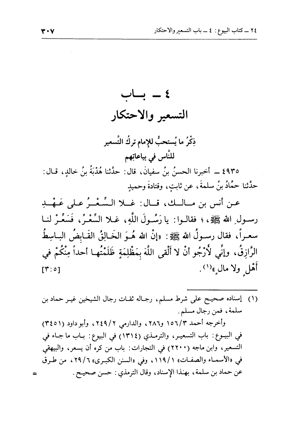 4935 - أَخْبَرَنَا الْحَسَنُ بْنُ سُفْيَانَ، قَالَ: حَدَّثَنَا هُدْبَةُ بْنُ خَالِدٍ، قَالَ: حَدَّثَنَا حَمَّادُ بْنُ سَلَمَةَ، عَنْ ثَابِتٍ وَقَتَادَةَ وَحُمَيْدٍ عَنْ أَنَسِ بْنِ مَالِكٍ، قَالَ: غَلَا السِّعْرُ عَلَى عَهْدِ رَسُولِ اللَّهِ صَلَّى اللَّهُ عَلَيْهِ وَسَلَّمَ؛ فَقَالُوا: يَا رَسُولَ اللَّهِ، غَلَا السِّعْرُ، فَسَعِّرْ لَنَا سِعْرًا، فَقَالَ رَسُولُ اللَّهِ صَلَّى اللَّهُ عَلَيْهِ وَسَلَّمَ: "إِنَّ اللَّهَ هُوَ الْخَالِقُ الْقَابِضُ الْبَاسِطُ الرَّازِقُ، وَإِنِّي لَأَرْجُو أَنْ لَا أَلْقَى اللَّهَ بِمَظْلِمَةٍ ظَلَمْتُهَا أَحَدًا منكم في أهل ولا مال"1. [5: 3]