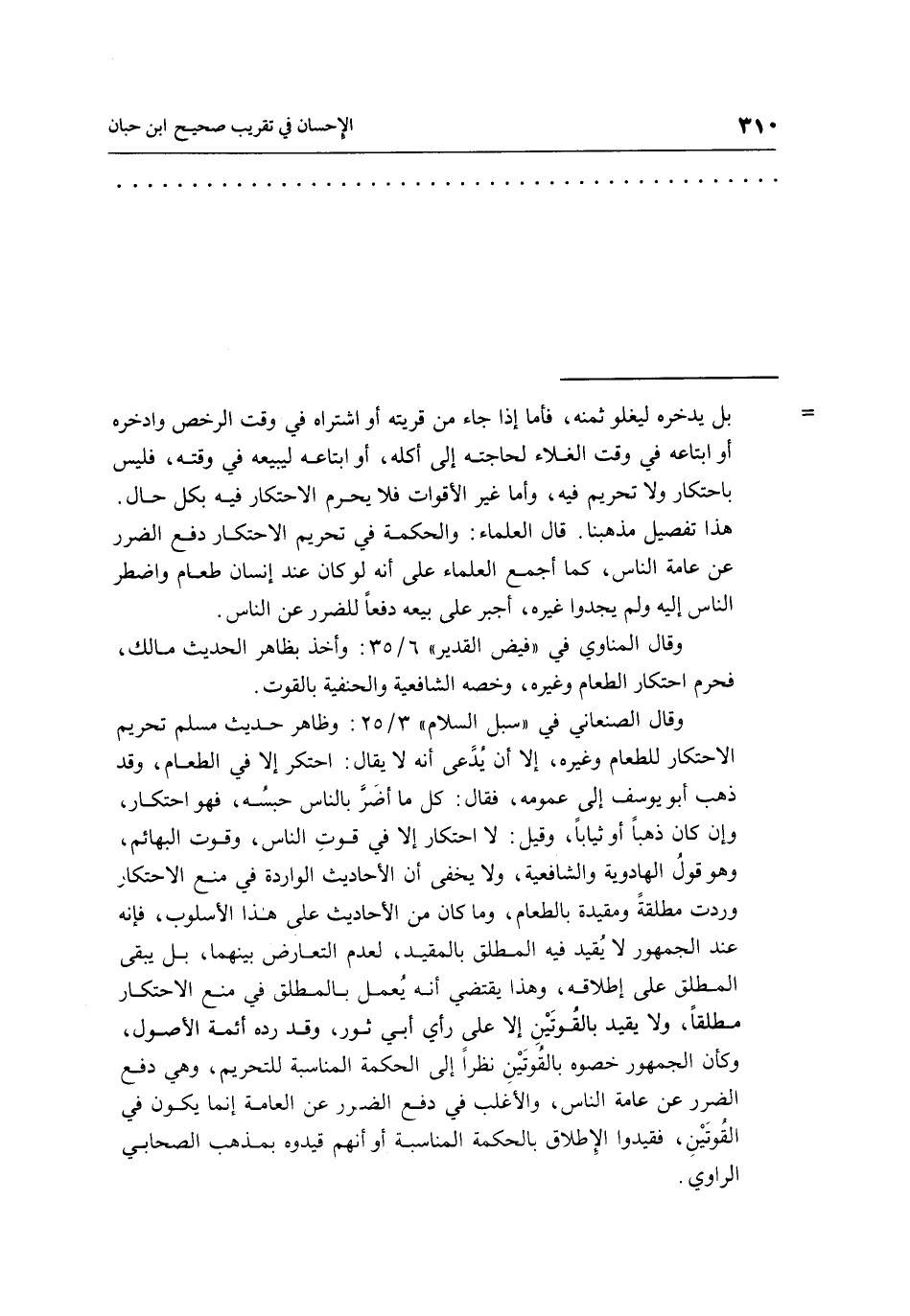 وقال الصنعاني في "سبل السلام" 3/25: وظاهر حديث مسلم تحريم الاحتكار للطعام وغيره، إلا أن يدعي أنه لايقال: احتكر إلا في الطعام، وقد ذهب أبو يوسف إلى عمومه، فقال: كل ما أضر بالناس حبسه، فهو احتكار، وإن كان ذهباً أو ثياباً، وقيل: لا احتكار إلا في قوت الناس، وقوت البهائم، وهو قول الهادوية والشافعية، ولا يخفى أن الأحاديث الواردة في منع الاحتكار وردت مطلقة ومقيدة بالطعام، وما كان من الأحاديث على هذا الأسلوب، فإنه عند الجمهور لايقيد فيه المطلق بالمقيد، لعدم التعارض بينهما، بل يبقى المطلق على إطلاقه، وهذا يقتضي أنه يعمل بالمطلق في منع الاحتكار مطلقاً، على إطلاقه، وهذا يقتضي أنه يعمل بالمطلق في منع الاحتكار مطلقاً، ولايقيد بالقوتين إلا على رأي أبي ثور، وقد رده أئمة الأصول، وكأن الجمهور خصوه بالقوتين نظراً إلى الحكمة المناسبة للتحريم، وهي دفع الضرر عن عامة الناس، والأغلب في دفع الضرر عن العامة إنما يكون في القوتين، فقيدوال الإطلاق بالحكمة المناسبة أو أنهم قيدوه بمذهب الصحابي والرواي.