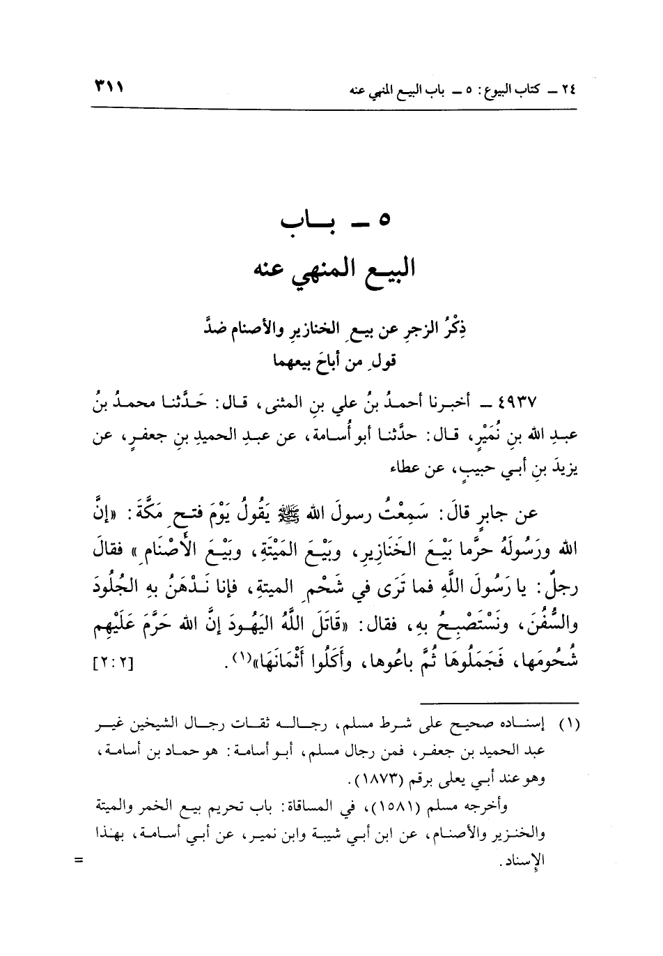 4937 - أَخْبَرَنَا أَحْمَدُ بْنُ عَلِيِّ بْنِ الْمُثَنَّى، قَالَ: حَدَّثَنَا مُحَمَّدُ بْنُ عَبْدِ اللَّهِ بْنِ نُمَيْرٍ، قَالَ: حَدَّثَنَا أَبُو أُسَامَةَ، عَنْ عَبْدِ الْحَمِيدِ بْنِ جَعْفَرٍ، عَنْ يَزِيدَ بْنِ أَبِي حَبِيبٍ، عَنْ عَطَاءٍ عَنْ جَابِرٍ قَالَ: سَمِعْتُ رَسُولَ اللَّهِ صَلَّى اللَّهُ عَلَيْهِ وسلم يقول: يَوْمَ فَتْحِ مَكَّةَ: "إِنَّ اللَّهَ وَرَسُولَهُ حَرَّمَا بَيْعَ الْخَنَازِيرِ، وَبَيْعَ الْمَيْتَةِ، وَبَيْعَ الْأَصْنَامِ" فَقَالَ رَجُلٌ: يَا رَسُولَ اللَّهِ فَمَا تَرَى فِي شَحْمِ الْمَيْتَةِ، فَإِنَّا نَدْهِنُ بِهِ الْجُلُودَ وَالسُّفُنَ، وَنَسْتَصْبِحُ بِهِ، فَقَالَ: "قَاتَلَ اللَّهُ الْيَهُودَ إِنَّ اللَّهَ حَرَّمَ عَلَيْهِمْ شُحُومَهَا، فَجَمَلُوهَا ثُمَّ بَاعُوهَا، وأكلوا أثمانها" 1. [2: 2]