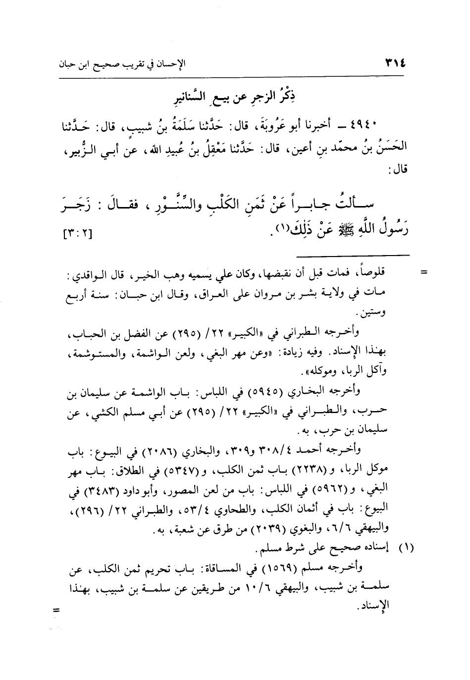 4940 - أَخْبَرَنَا أَبُو عَرُوبَةَ، قَالَ: حَدَّثَنَا سَلَمَةُ بْنُ شَبِيبٍ، قَالَ: حَدَّثَنَا الْحَسَنُ بْنُ مُحَمَّدِ بْنِ أَعْيَنَ، قَالَ: حَدَّثَنَا مَعْقِلُ بْنُ عُبَيْدِ اللَّهِ، عَنْ أَبِي الزُّبَيْرِ، قَالَ: سَأَلْتُ جَابِرًا عَنْ ثَمَنِ الْكَلْبِ وَالسِّنَّوْرِ، فَقَالَ: "زَجَرَ رَسُولُ اللَّهِ صَلَّى اللَّهُ عَلَيْهِ وَسَلَّمَ عن ذلك" 1. [2: 3]