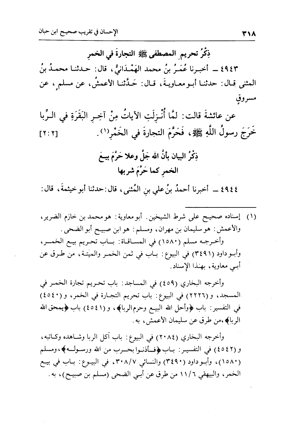 4943 - أَخْبَرَنَا عُمَرُ بْنُ مُحَمَّدٍ الْهَمْدَانِيُّ قَالَ: حَدَّثَنَا مُحَمَّدُ بْنُ الْمُثَنَّى قَالَ: حَدَّثَنَا أَبُو مُعَاوِيَةَ، قَالَ: حَدَّثَنَا الْأَعْمَشُ، عَنْ مُسْلِمٍ، عَنْ مَسْرُوقٍ عَنْ عَائِشَةَ قَالَتْ: "لَمَّا أُنْزِلَتِ الْآيَاتُ مِنْ آخِرِ الْبَقَرَةِ فِي الرِّبَا خَرَجَ رَسُولُ اللَّهِ صَلَّى اللَّهُ عَلَيْهِ وَسَلَّمَ، فحرم التجارة في الخمر"1. [2: 2]