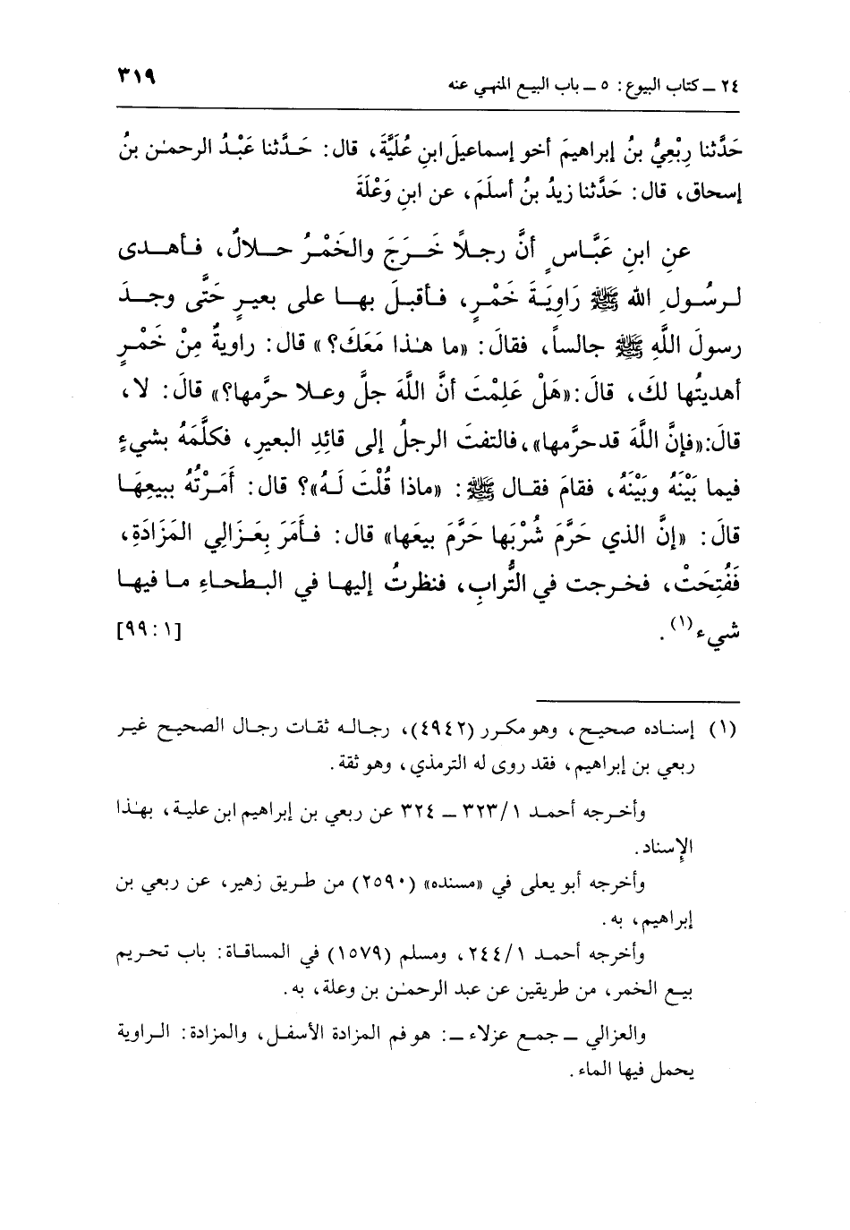 4944 - أَخْبَرَنَا أَحْمَدُ بْنُ عَلِيِّ بْنِ الْمُثَنَّى، قَالَ: حَدَّثَنَا أَبُو خَيْثَمَةَ، قَالَ: حَدَّثَنَا رِبْعِيُّ بْنُ إِبْرَاهِيمَ أَخُو إسماعيل بن عُلَيَّةَ، قَالَ: حَدَّثَنَا عَبْدُ الرَّحْمَنِ بْنُ إِسْحَاقَ، قَالَ: حدثنا زيد بن أسلم، عن بن وعلة عن بن عَبَّاسٍ أَنَّ رَجُلًا خَرَجَ وَالْخَمْرُ حَلَالٌ، فَأَهْدَى لِرَسُولِ اللَّهِ صَلَّى اللَّهُ عَلَيْهِ وَسَلَّمَ رَاوِيَةَ خَمْرٍ، فَأَقْبَلَ بِهَا عَلَى بَعِيرٍ حَتَّى وَجَدَ رَسُولُ اللَّهِ صَلَّى اللَّهُ عَلَيْهِ وَسَلَّمَ جَالِسًا، فَقَالَ: "مَا هَذَا مَعَكَ؟ " قَالَ: رَاوِيَةٌ مِنْ خَمْرٍ أَهْدَيْتُهَا لَكَ قَالَ: "هَلْ عَلِمْتَ أَنَّ اللَّهَ جَلَّ وَعَلَا حَرَّمَهَا؟ " قَالَ: لَا، قَالَ: "فَإِنَّ اللَّهَ قَدْ حَرَّمَهَا" فَالْتَفَتَ الرَّجُلُ إِلَى قَائِدِ الْبَعِيرِ، فَكَلَّمَهُ بِشَيْءٍ فِيمَا بَيْنَهُ وَبَيْنَهُ، فَقَامَ فَقَالَ صَلَّى اللَّهُ عَلَيْهِ وَسَلَّمَ: "مَاذَا قُلْتَ لَهُ؟ " قَالَ: أَمَرْتُهُ بِبَيْعِهَا قَالَ: "إِنَّ الَّذِي حَرَّمَ شُرْبَهَا حَرَّمَ بَيْعَهَا" قَالَ: فَأَمَرَ بِعَزَالِي الْمَزَادَةِ، فَفُتِحَتْ، فَخَرَجْتُ فِي التُّرَابِ، فَنَظَرْتُ إليها في البطحاء ما فيها شيء1. [1: 99]