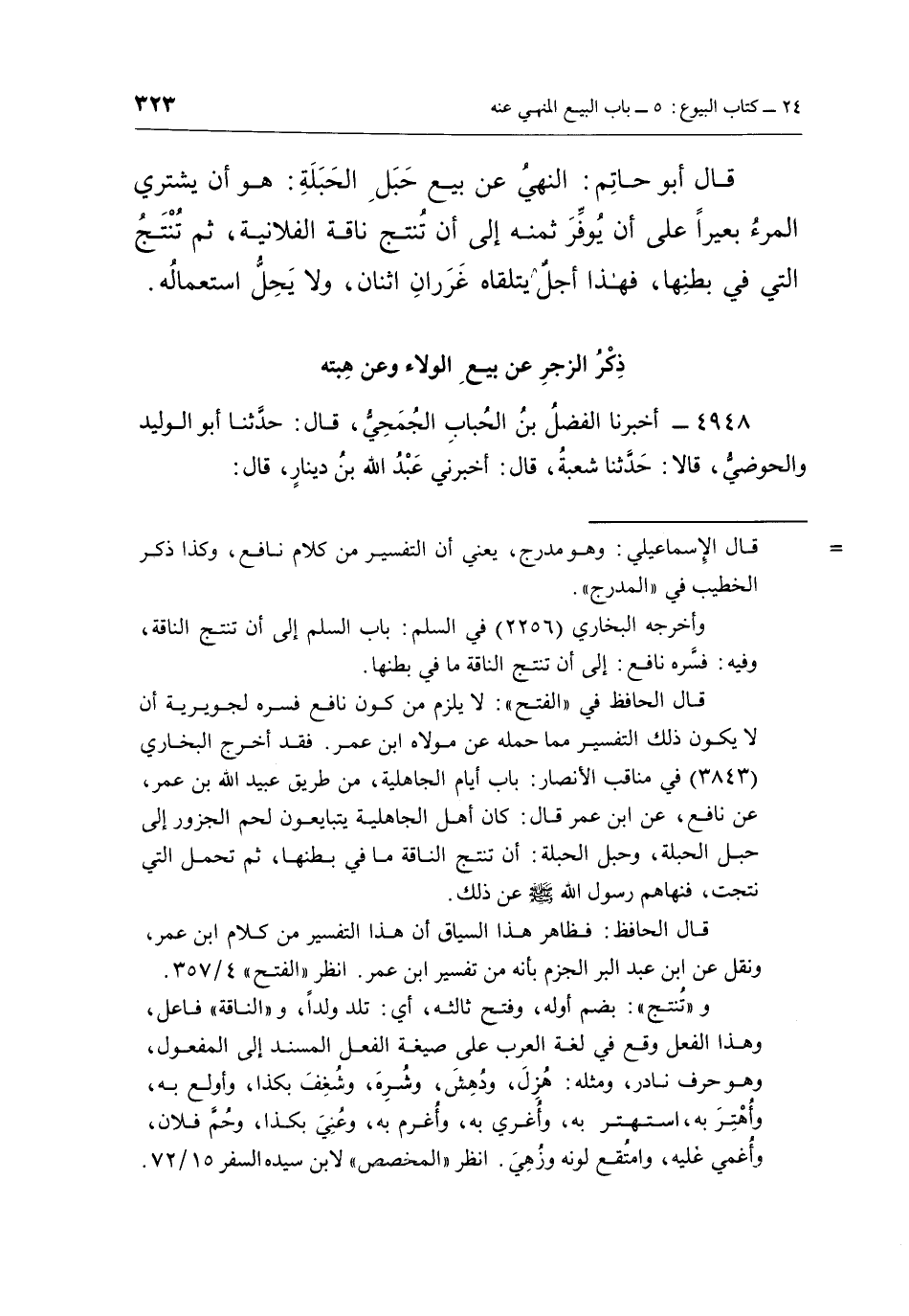 قَالَ أَبُو حَاتِمٍ: النَّهْيُ عَنْ بَيْعِ حَبَلِ الْحَبَلَةِ: هُوَ أَنْ يَشْتَرِيَ الْمَرْءُ بَعِيرًا عَلَى أَنْ يُوَفِّرَ ثَمَنَهُ إِلَى أَنْ تُنْتَجَ نَاقَةُ الْفُلَانِيَّةِ، ثُمَّ تُنْتَجُ الَّتِي فِي بَطْنِهَا، فَهَذَا أَجَلٌ يَتَلَقَّاهُ غَرَرَانِ، اثْنَانِ، وَلَا يَحِلُّ اسْتِعْمَالُهُ