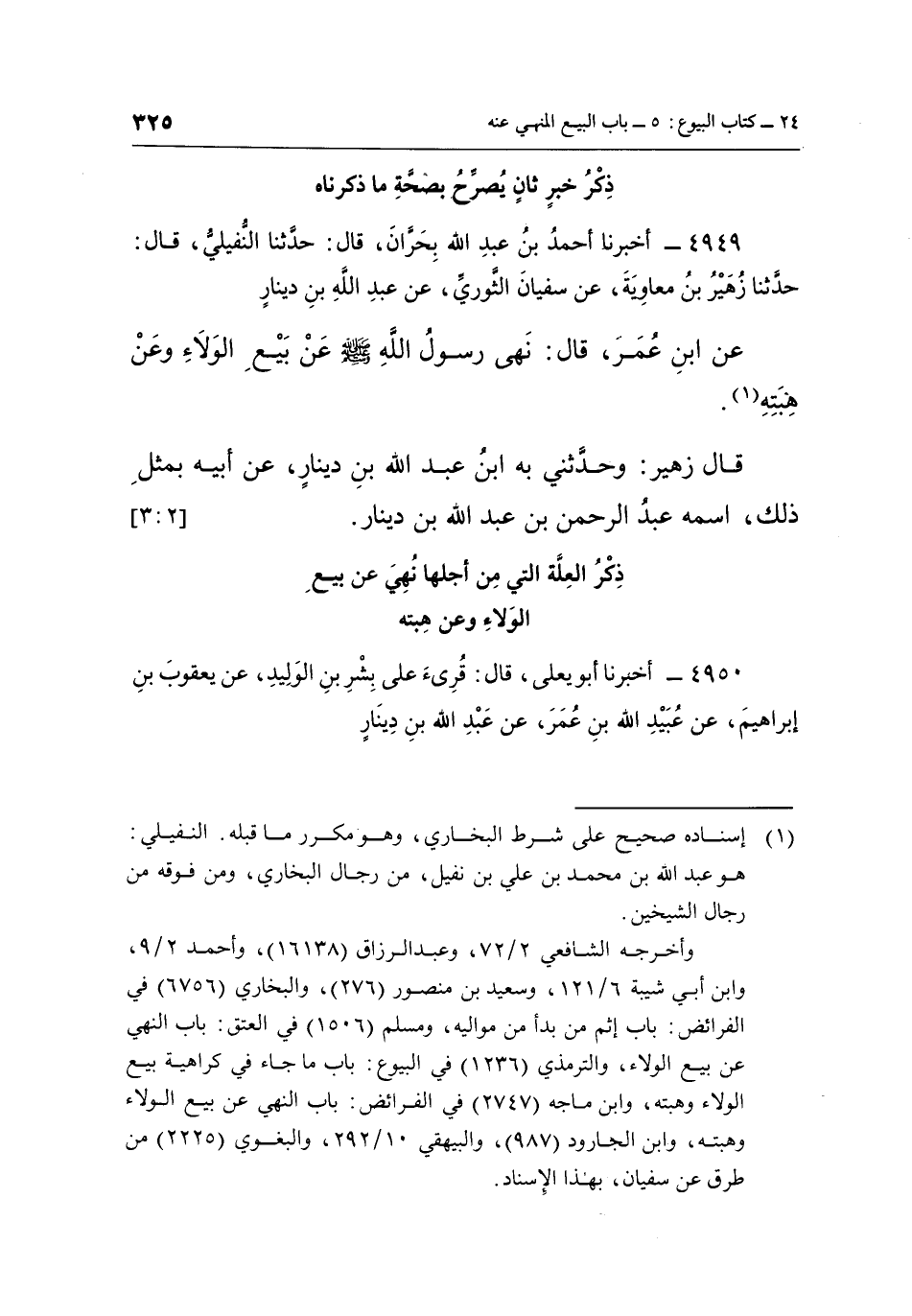 4949 - أَخْبَرَنَا أَحْمَدُ بْنُ عَبْدِ اللَّهِ بِحَرَّانَ، قَالَ: حَدَّثَنَا النُّفَيْلِيُّ، قَالَ: حَدَّثَنَا زُهَيْرُ بْنُ مُعَاوِيَةَ، عَنْ سُفْيَانَ الثَّوْرِيِّ، عَنْ عَبْدِ اللَّهِ بْنِ دينار عن بن عُمَرَ قَالَ: "نَهَى رَسُولُ اللَّهِ صَلَّى اللَّهُ عَلَيْهِ وَسَلَّمَ عَنْ بَيْعِ الْوَلَاءِ وَعَنْ هِبَتِهِ"1.
