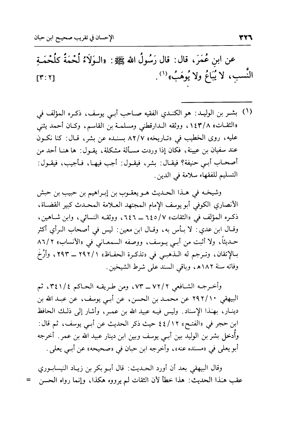 4950 - أَخْبَرَنَا أَبُو يَعْلَى، قَالَ: قُرِئَ عَلَى بِشْرِ بْنِ الْوَلِيدِ، عَنْ يَعْقُوبَ بْنِ إِبْرَاهِيمَ، عَنْ عُبَيْدِ اللَّهِ بْنِ عُمَرَ، عَنْ عَبْدِ اللَّهِ بْنِ دينارعن بْنَ عُمَرَ، قَالَ: قَالَ رَسُولُ اللَّهِ صَلَّى اللَّهُ عَلَيْهِ وَسَلَّمَ: "الْوَلَاءُ لُحْمَةٌ كَلُحْمَةِ النَّسَبِ، لَا يباع ولا يوهب"1. [2: 3]