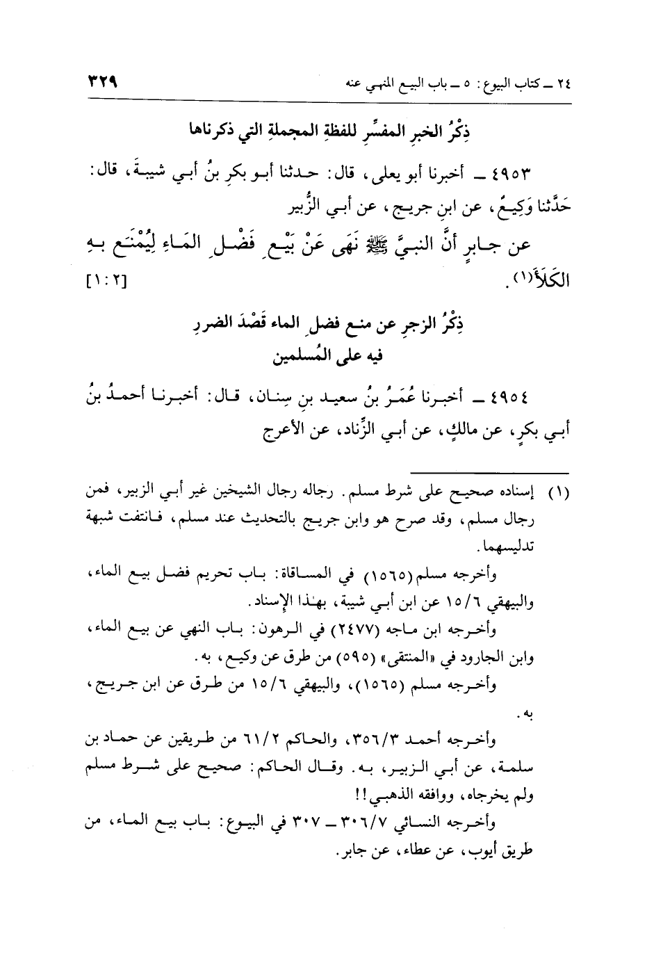 4953 - أَخْبَرَنَا أَبُو يَعْلَى، قَالَ: حَدَّثَنَا أَبُو بَكْرِ بْنُ أَبِي شَيْبَةَ، قَالَ: حَدَّثَنَا وَكِيعٌ، عَنْ بن جُرَيْجٍ، عَنْ أَبِي الزُّبَيْرِ عَنْ جَابِرٍ أَنَّ النَّبِيَّ صَلَّى اللَّهُ عَلَيْهِ وسلم: "نهى عن بيع فضل الماء ليمنع به الكلأ"1. [2: 1]