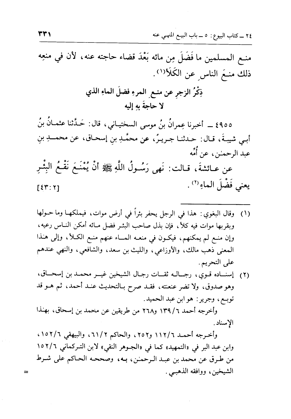 4955 - أَخْبَرَنَا عِمْرَانُ بْنُ مُوسَى السِّخْتِيَانِيُّ، قَالَ: حَدَّثَنَا عُثْمَانُ بْنُ أَبِي شَيْبَةَ، قَالَ: حَدَّثَنَا جَرِيرٌ، عَنْ مُحَمَّدِ بْنِ إِسْحَاقَ، عَنْ مُحَمَّدِ بْنِ عَبْدِ الرَّحْمَنِ، عَنْ أُمِّهِ عَنْ عَائِشَةَ، قَالَتْ: "نَهَى رَسُولُ اللَّهِ صَلَّى اللَّهُ عَلَيْهِ وَسَلَّمَ أَنْ يُمْنَعَ نَقْعُ الْبِئْرِ يَعْنِي فَضْلَ الْمَاءِ" 1. [2: 43]