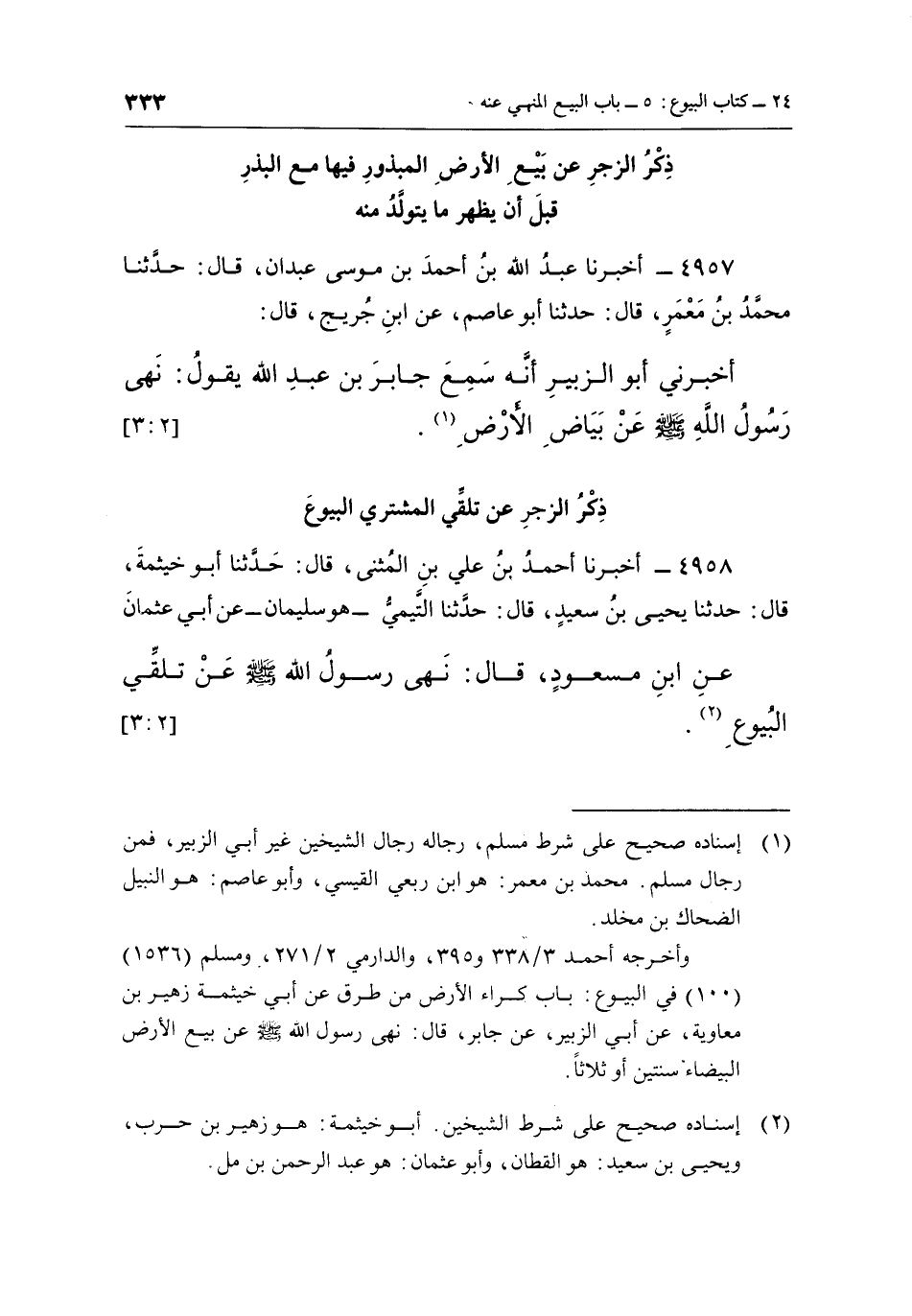 4958 - أَخْبَرَنَا أَحْمَدُ بْنُ عَلِيِّ بْنِ الْمُثَنَّى، قَالَ، حَدَّثَنَا أَبُو خَيْثَمَةَ، قَالَ: حَدَّثَنَا يَحْيَى بْنُ سَعِيدٍ، قَالَ: حَدَّثَنَا التَّيْمِيُّ - هُوَ سُلَيْمَانُ - عَنْ أَبِي عُثْمَانَ عَنِ ابْنِ مَسْعُودٍ، قَالَ: "نَهَى رَسُولُ اللَّهِ صَلَّى اللَّهُ عَلَيْهِ وَسَلَّمَ عَنْ تَلَقِّي البيوع" 1. [2: 3]