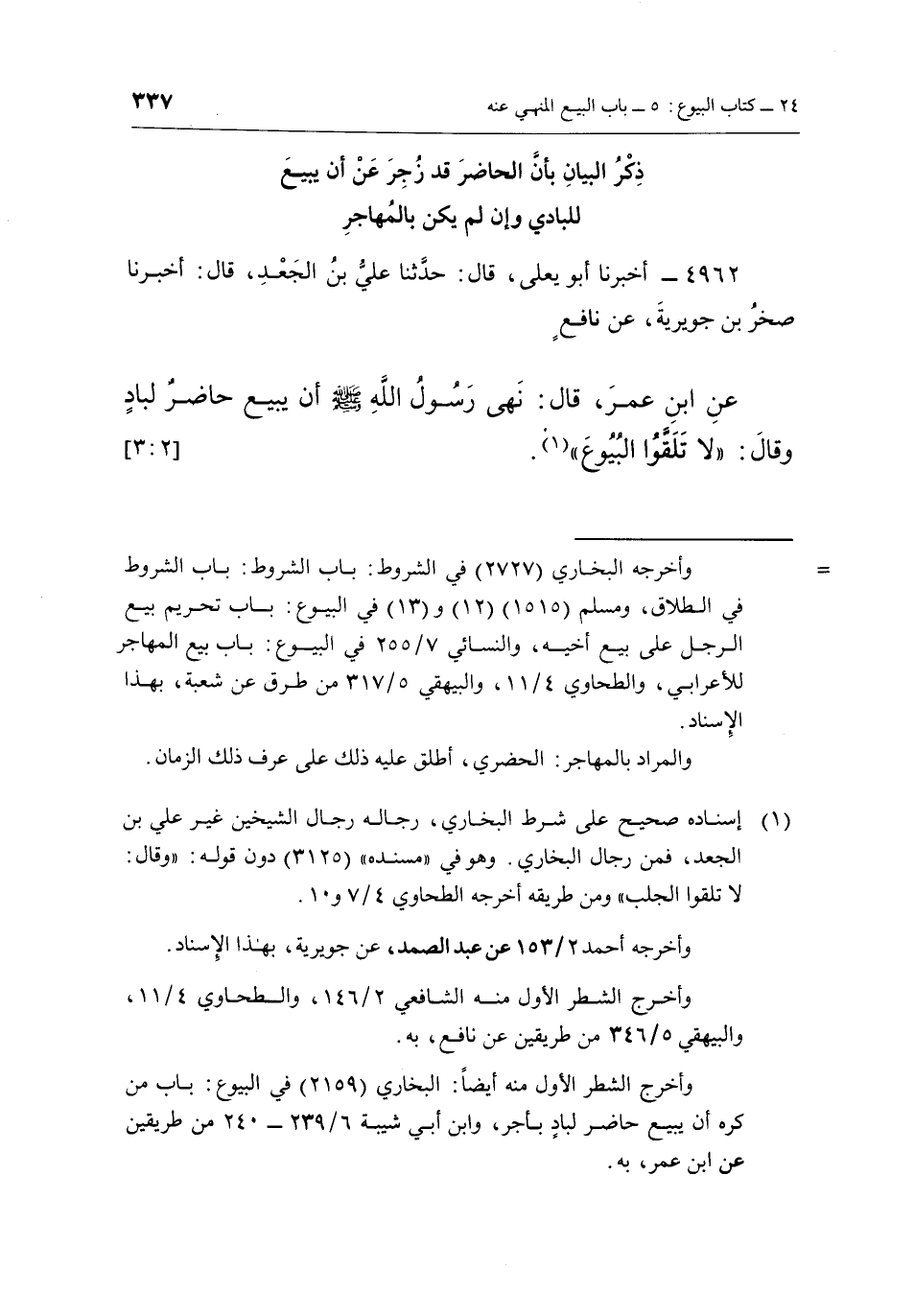 4962 - أَخْبَرَنَا أَبُو يَعْلَى، قَالَ: حَدَّثَنَا عَلِيُّ بْنُ الْجَعْدِ، قَالَ: أَخْبَرَنَا صَخْرُ بْنُ جُوَيْرِيَةَ، عَنْ نافع عن بن عُمَرَ، قَالَ: نَهَى رَسُولُ اللَّهِ صَلَّى اللَّهُ عَلَيْهِ وَسَلَّمَ أَنْ يَبِيعَ حَاضِرٌ لِبَادٍ وَقَالَ: "لا تلقوا البيوع"1. [2: 3]