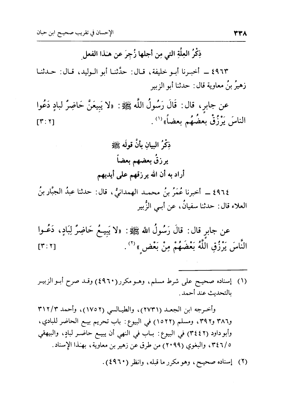 4963 - أَخْبَرَنَا أَبُو خَلِيفَةَ، قَالَ: حَدَّثَنَا أَبُو الْوَلِيدِ، قَالَ: حَدَّثَنَا زُهَيْرُ بْنُ مُعَاوِيَةَ قَالَ: حَدَّثَنَا أَبُو الزُّبَيْرِ عَنْ جَابِرٍ، قَالَ: قَالَ رَسُولُ اللَّهِ صَلَّى اللَّهُ عَلَيْهِ وَسَلَّمَ: "لَا يَبِيعَنَّ حَاضِرٌ لِبَادٍ دَعُوا النَّاسَ يَرْزُقُ بعضهم بعضا"1. [2: 3]