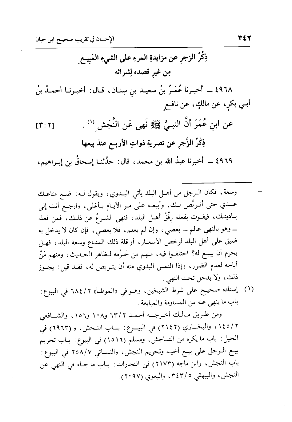 4968 أَخْبَرَنَا عُمَرُ بْنُ سَعِيدِ بْنِ سِنَانٍ، قَالَ: أَخْبَرَنَا أَحْمَدُ بْنُ أَبِي بَكْرٍ، عَنْ مَالِكٍ، عَنْ نَافِعٍ عَنِ ابْنِ عُمَرَ: "إِنَّ النَّبِيَّ صَلَّى اللَّهُ عَلَيْهِ وسلم نهى عن النجش" 1. [2: 3]