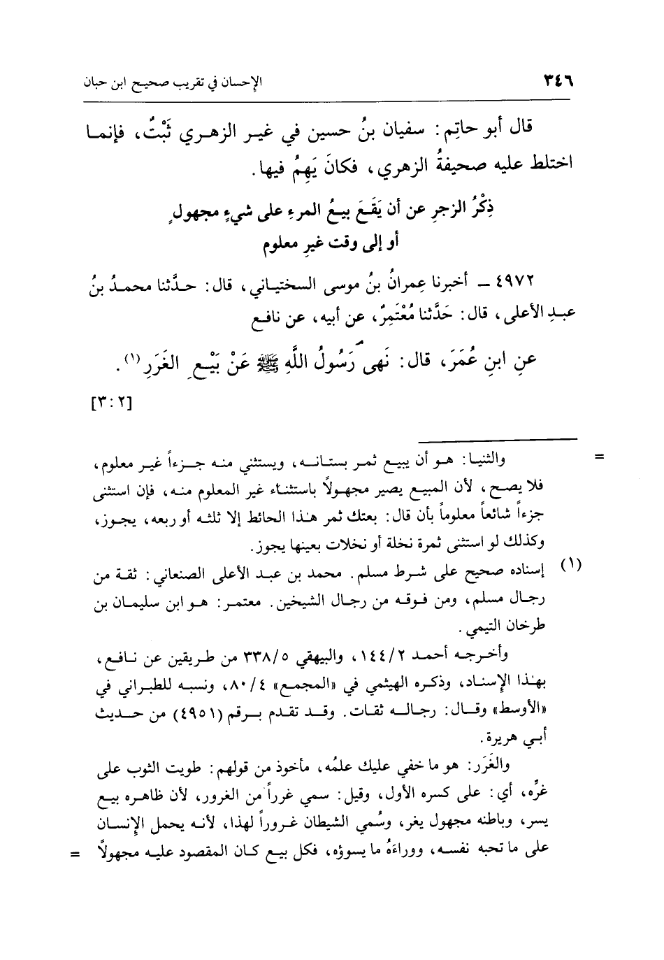 4972 - أَخْبَرَنَا عِمْرَانُ بْنُ مُوسَى السِّخْتِيَانِيُّ، قَالَ: حَدَّثَنَا مُحَمَّدُ بْنُ عَبْدِ الْأَعْلَى، قَالَ: حَدَّثَنَا مُعْتَمِرٌ، عَنْ أَبِيهِ، عَنْ نَافِعٍ عَنِ ابْنِ عُمَرَ، قَالَ: "نَهَى رَسُولُ اللَّهِ صَلَّى اللَّهُ عَلَيْهِ وسلم عن بيع الغرر"1. [2: 3]
