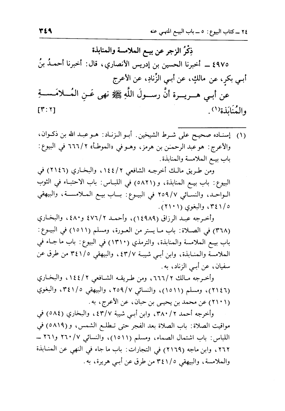 4975 - أَخْبَرَنَا الْحُسَيْنُ بْنُ إِدْرِيسَ الْأَنْصَارِيُّ، قَالَ: أَخْبَرَنَا أَحْمَدُ بْنُ أَبِي بَكْرٍ، عَنْ مَالِكٍ، عَنْ أَبِي الزِّنَادِ، عَنِ الْأَعْرَجِ عَنْ أَبِي هُرَيْرَةَ: "أَنَّ رَسُولَ اللَّهِ صَلَّى اللَّهُ عليه وسلم نهى عن الملامسة والمنابذة"1. [2: 3]
