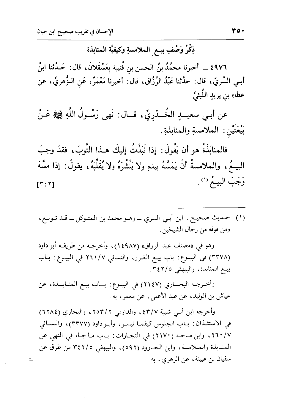 4976 - أَخْبَرَنَا مُحَمَّدُ بْنُ الْحَسَنِ بْنِ قُتَيْبَةَ بِعَسْقَلَانَ، قَالَ: حدثنا بْنُ أَبِي السَّرِيِّ، قَالَ: حَدَّثَنَا عَبْدُ الرَّزَّاقِ، قَالَ: أَخْبَرَنَا مَعْمَرٌ، عَنِ الزُّهْرِيِّ، عَنْ عَطَاءِ بْنِ يَزِيدَ اللَّيْثِيِّ عَنْ أَبِي سَعِيدٍ الْخُدْرِيَّ، قَالَ: "نَهَى رَسُولُ اللَّهِ صَلَّى اللَّهُ عَلَيْهِ وَسَلَّمَ عَنْ بَيْعَتَيْنِ: الْمُلَامَسَةِ وَالْمُنَابَذَةِ". فَالْمُنَابَذَةُ هُوَ أَنْ يَقُولَ: إِذَا نَبَذْتُ إِلَيْكَ هَذَا الثَّوْبَ، فَقَدْ وَجَبَ الْبَيْعُ، وَالْمُلَامَسَةُ أَنْ يَمَسَّهُ بِيَدِهِ وَلَا يَنْشُرُهُ وَلَا يُقَلِّبُهُ، يَقُولُ: إِذَا مَسَّهُ وجب البيع" 1. [2: 3]