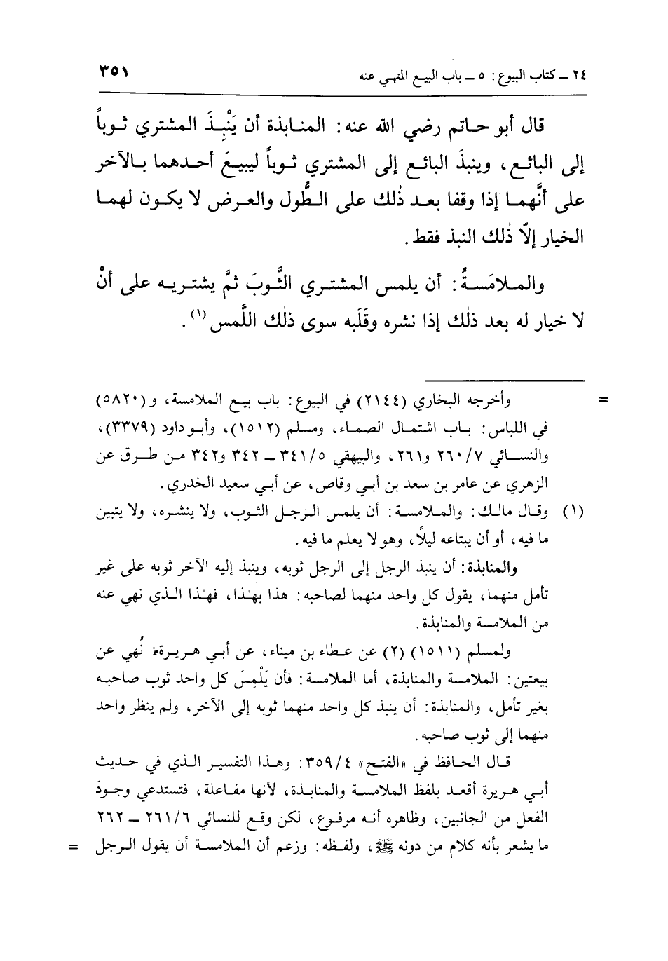 وقال الحافظ في "الفتح" 4/359: وهذا التفسير الذي في حديث أبي هريرة أقعد بلفظ الملامسة والمنابذة، لأنها مفاعلة فتستدعي وجود الفعل من الجانبين، وظاهره أنه مرفوع، لكن وقع للنسائي 6/261 - 262 ما يشعر بأنه كلام من دونه صلى الله عليه وسلمن ولفظه: وزعم الملامسة أن يقول الرجل للرجل: أبيعك ثوبي بوثك، ولا ينظر واحد منهما إلى ثوب الآخر، ولكن يلمسه لمساًن وأما المنابذة فأن يقول: أنبذ ما معي وتنبذ ما معك ليشتري أحدهما من الآخر، ولا يدري كل واحد منهما كم مع الآخر ونحو من هذا الوصف، فالأقرب أن يكون ذلك من كلام الصحابي لبعد أن يعبر الصحابي عن النبي صلى الله عليه وسلم بلفظ "زعم".