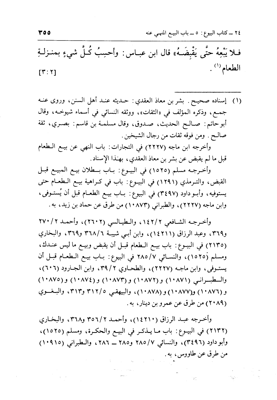 4980 - أَخْبَرَنَا عُمَرُ بْنُ مُحَمَّدٍ الْهَمْدَانِيُّ، قَالَ: حَدَّثَنَا بِشْرُ بْنُ مُعَاذٍ الْعَقَدِيُّ، قَالَ: حَدَّثَنَا حَمَّادُ بْنُ زَيْدٍ قَالَ: حَدَّثَنِي عَمْرُو بْنُ دِينَارٍ، عَنْ طَاوُسٍ عن بْنِ عَبَّاسٍ قَالَ: قَالَ رَسُولُ اللَّهِ صَلَّى اللَّهُ عَلَيْهِ وَسَلَّمَ: "مَنِ اشْتَرَى طَعَامًا، فَلَا يَبِعْهُ حَتَّى يَقْبِضَهُ" قَالَ ابْنُ عَبَّاسٍ: وَأَحْسِبُ كُلَّ شَيْءٍ بِمَنْزِلَةِ الطَّعَامِ1. [2: 3]