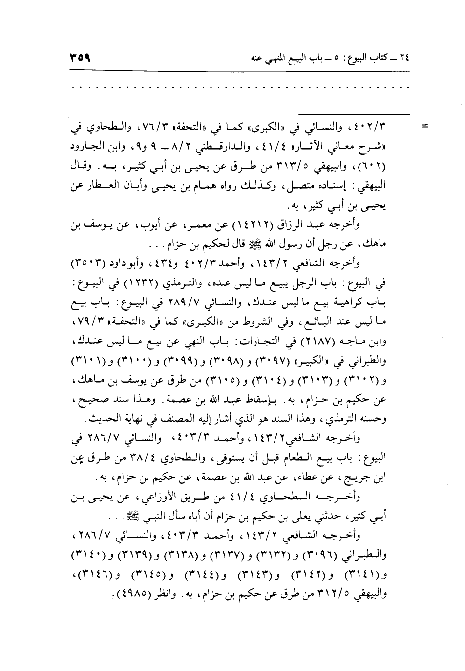 وأخرجه الشافعي 2/143، وأحمد 402و434، وأبو داود "3503" في البيوع: باب الرجل يبيع ما ليس عنده، والترمذي "1232" في البيوع: باب كراهية بيع ماليس عندك، والنسائي 7/289 في البيوع: باب بيع ما ليس عند البائع، وفي الشروط من "الكبرى" كما في "التحفة" 3/79، وابن ماجه "2187" في التجارات: باب النهي عن بيع ماليس عندكن والطبراني في "الكبير" "3097" و"3098" و"3099" و"3100" و"3101" و"3102" و"3103" و"3104" و"3105" من طرق عن يوسف بن ماهك، عن حيكم بن حزام، به. وبإسقاط عبد الله بن عصمة. هذا سند صحيح، وحسنه الترمذي، وهذا السند الذي هو أشار إليه المصنف في نهاية الحديث. وأخرجه الشافعي 2/143، وأحمد 3/403، والنسائي 7/286 في البيوع: باب بيع الطعام قبل أن يستوفي، والطحاوي 4/38 من طرق عن وابن جريج، عن عطاء عن عبد الله بن عصمة، عن حكيم بن حزام، به.