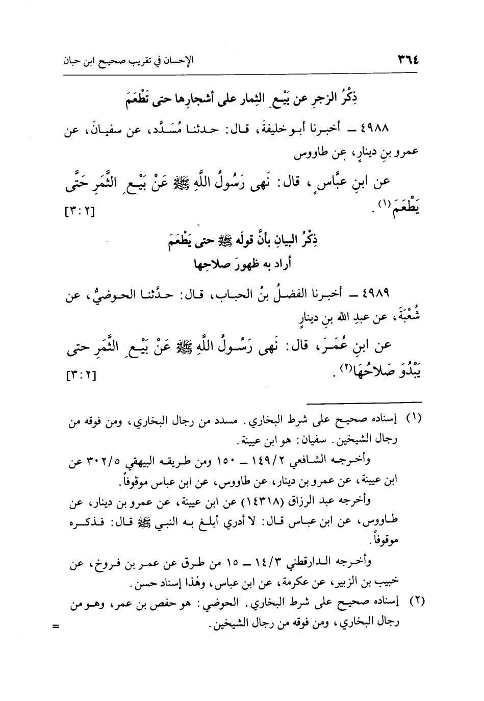 4988 - أَخْبَرَنَا أَبُو خَلِيفَةَ، قَالَ: حَدَّثَنَا مُسَدَّدٌ عَنْ سُفْيَانُ، عَنْ عَمْرِو بْنِ دِينَارٍ، عَنْ طَاوُسٍ عن بن عَبَّاسٍ، قَالَ: "نَهَى رَسُولُ اللَّهِ صَلَّى اللَّهُ عَلَيْهِ وَسَلَّمَ عَنْ بَيْعِ الثَّمَرِ حَتَّى يَطْعَمَ" 1. [2: 3]