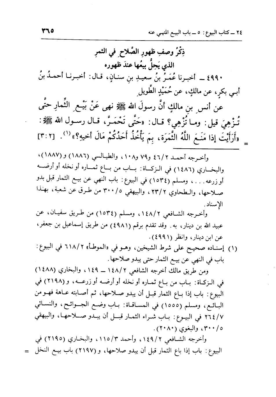 4990 - أَخْبَرَنَا عُمَرُ بْنُ سَعِيدِ بْنِ سِنَانٍ، قَالَ: أَخْبَرَنَا أَحْمَدُ بْنُ أَبِي بَكْرٍ، عَنْ مَالِكٍ، عَنْ حُمَيْدٌ الطَّوِيلُ عَنْ أَنَسِ بْنِ مَالِكٍ: أَنَّ رَسُولَ اللَّهِ صَلَّى اللَّهُ عَلَيْهِ وَسَلَّمَ نَهَى عَنْ بَيْعِ الثِّمَارِ حَتَّى تُزْهِيَ قِيلَ: وَمَا تُزْهِي؟ قَالَ: "حَتَّى تَحْمَرَّ"، قَالَ رَسُولُ اللَّهِ صَلَّى اللَّهُ عَلَيْهِ وَسَلَّمَ: "أَرَأَيْتَ إِذَا مَنَعَ اللَّهُ الثَّمَرَةَ، بم يأخذ أحدكم مال أخيه؟ " 1. [2: 3]