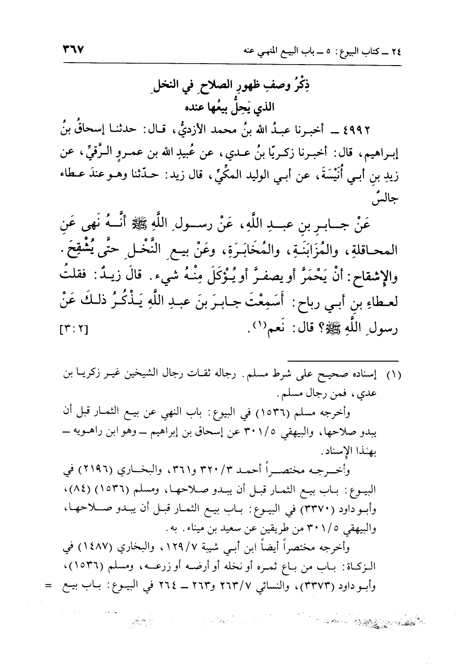 4992 - أَخْبَرَنَا عَبْدُ اللَّهِ بْنُ مُحَمَّدٍ الْأَزْدِيُّ، قَالَ: حَدَّثَنَا إِسْحَاقُ بْنُ إِبْرَاهِيمَ قَالَ: أَخْبَرَنَا زَكَرِيَّا بْنُ عَدِيٍّ، عَنْ عُبَيْدُ اللَّهِ بْنُ عَمْرٍو الرَّقِّيُّ، عَنْ زَيْدِ بْنِ أَبِي أُنَيْسَةَ، عَنْ أَبِي الْوَلِيدِ الْمَكِّيِّ، قَالَ: زَيْدٌ: حَدَّثَنَا وَهُوَ عِنْدَ عَطَاءٍ جَالِسٌ عَنْ جَابِرِ بْنِ عَبْدِ اللَّهِ، عَنْ رَسُولِ اللَّهِ صَلَّى اللَّهُ عَلَيْهِ وَسَلَّمَ: "أَنَّهُ نَهَى عن الْمُحَاقَلَةِ، وَالْمُزَابَنَةِ، وَالْمُخَابَرَةِ، وَعَنْ بَيْعِ النَّخْلِ حَتَّى يُشْقِحَ".