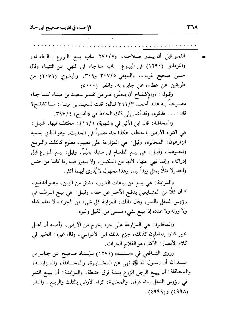= الثمر قبل أن يبدو صلاحهن و7/270 باب بيع الزرع بالطعامن والترمذي "1290"في البيوع: باب ماجاء في النهي عن الثنيا، وقال حسن صحيح غريبن والبيهقي 5/307 و309، والبغوي "2071" من طريقين عن عطاء، عن جابرن به. وانظر "5000"