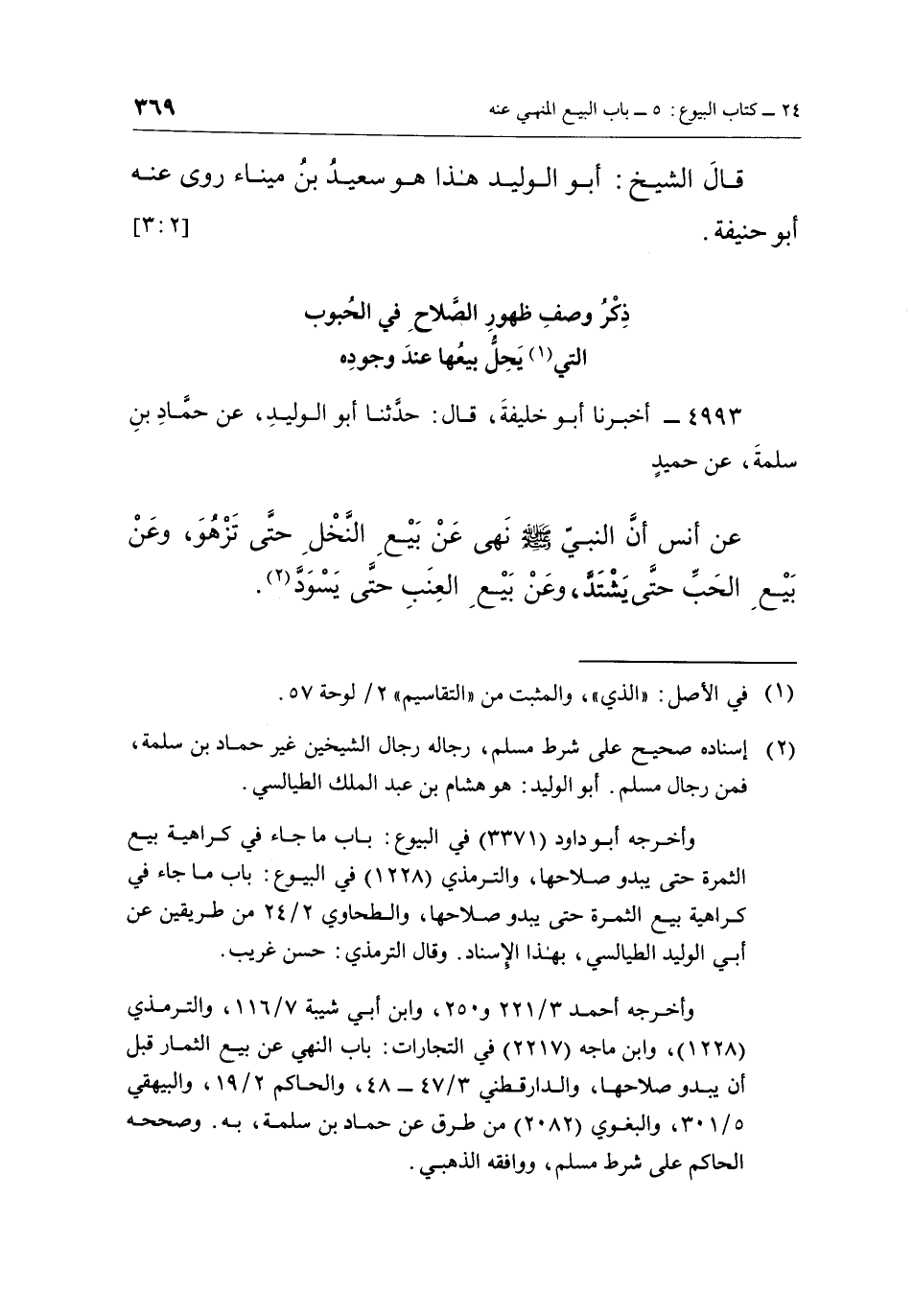 4993 - أَخْبَرَنَا أَبُو خَلِيفَةَ، قَالَ: حَدَّثَنَا أَبُو الْوَلِيدِ، عَنْ حَمَّادُ بْنُ سَلَمَةَ، عَنْ حُمَيْدٍ عَنْ أَنَسٍ: "أَنَّ النَّبِيَّ صَلَّى اللَّهُ عَلَيْهِ وَسَلَّمَ نَهَى عَنْ بَيْعِ النَّخْلِ حَتَّى تَزْهُوَ، وَعَنْ بَيْعِ الْحَبِّ حَتَّى يشتد، وعن بيع العنب حتى يسود"2.