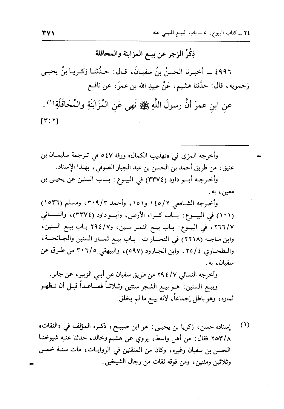 4996 - أَخْبَرَنَا الْحَسَنُ بْنُ سُفْيَانَ، قَالَ: حَدَّثَنَا زَكَرِيَّا بْنُ يَحْيَى زَحْمَوَيْهِ، قَالَ: حَدَّثَنَا هُشَيْمٌ، عَنْ عُبَيْدِ اللَّهِ بْنِ عُمَرَ عَنْ نَافِعٍ عَنِ ابْنِ عُمَرَ: "أَنَّ رَسُولَ اللَّهِ صَلَّى اللَّهُ عَلَيْهِ وَسَلَّمَ نَهَى عَنِ المزابنة والمحاقلة"1. [2: 3]